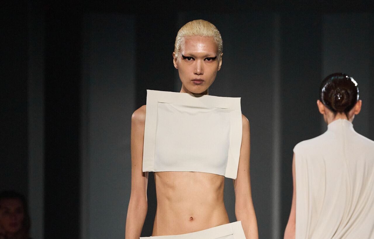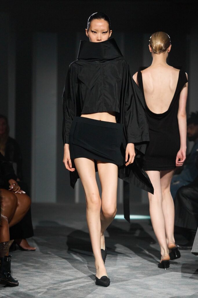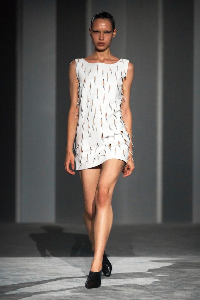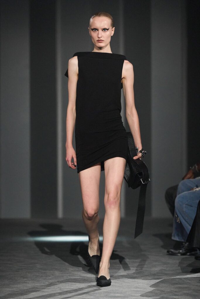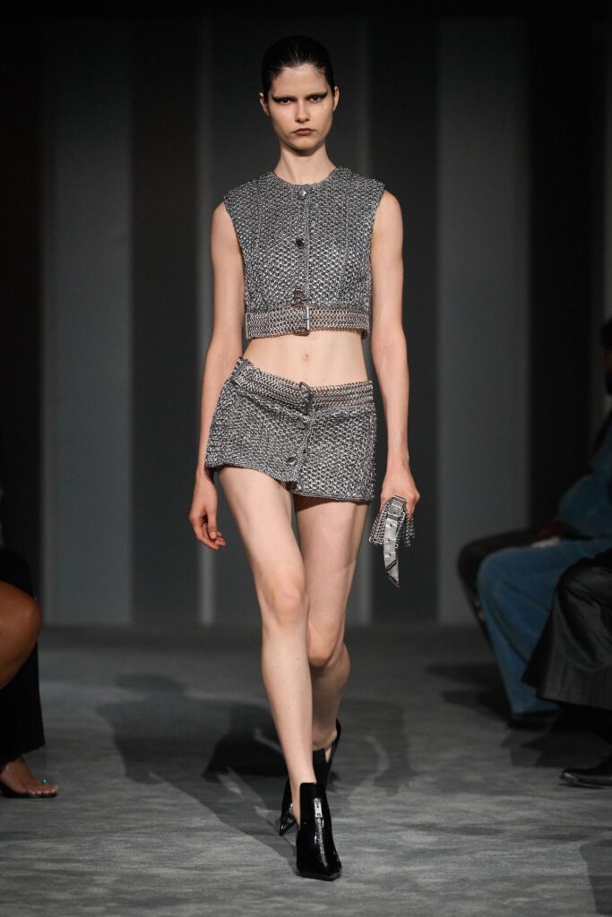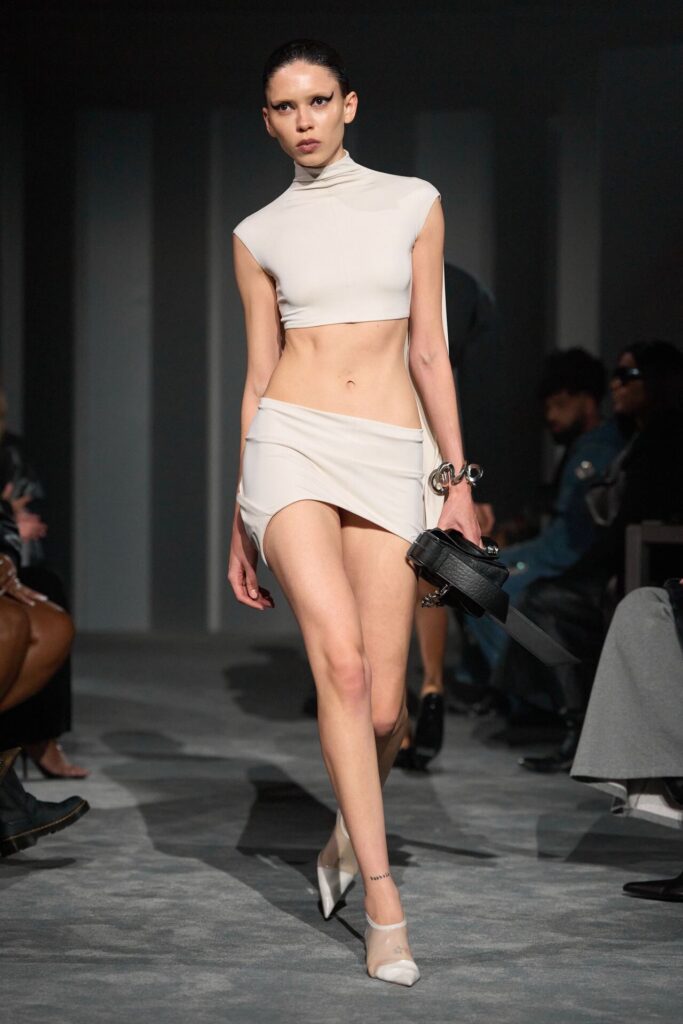 Sezonun renk paleti sadelikten yana: ağırlıklı olarak siyah, beyaz ve tonları arasında gezinilen gri. Ama bu nötrlük, tasarımlarda incelikle işlenmiş detaylarla kendini gösteriyor. Vücut hattına odaklanan ceketlerde, göğüs-altı ve kalçadan öne öne çıkan kesikler; mini eteklerle birlikte göğüs bölgesine oturan üstler dikkat çekiyor.