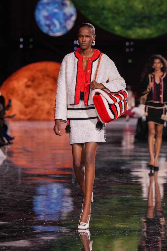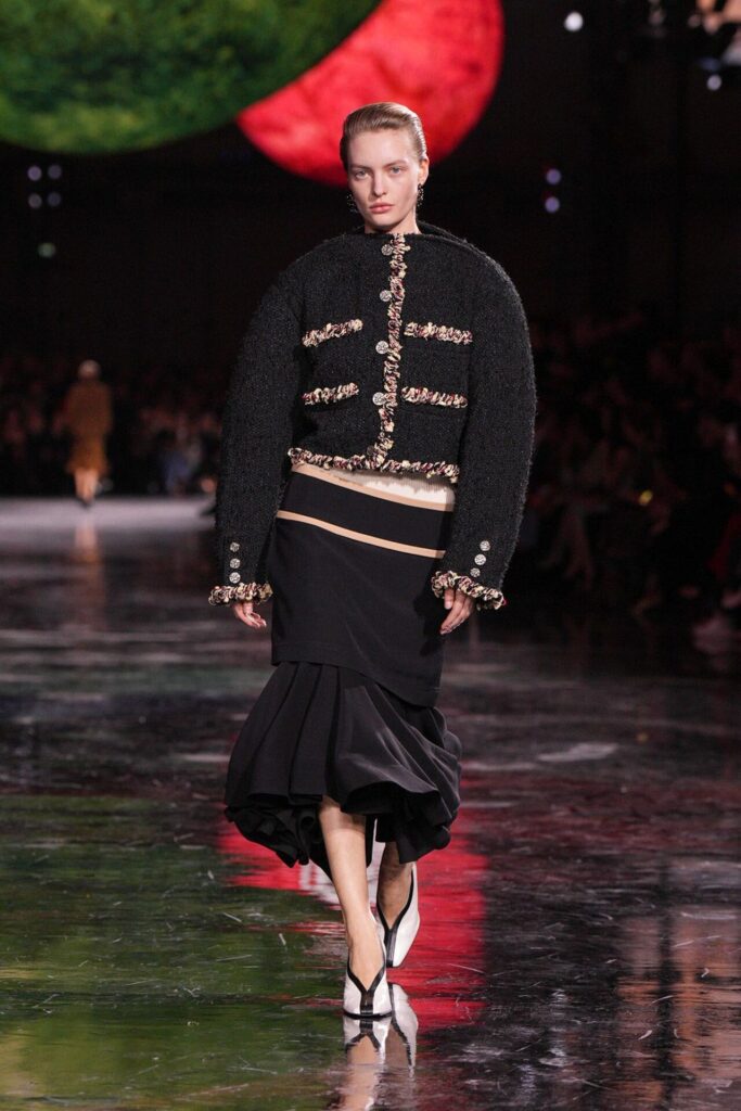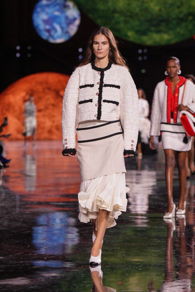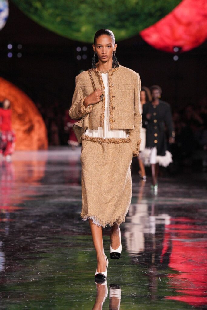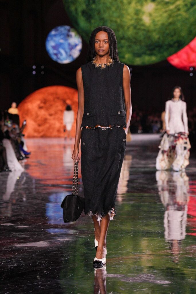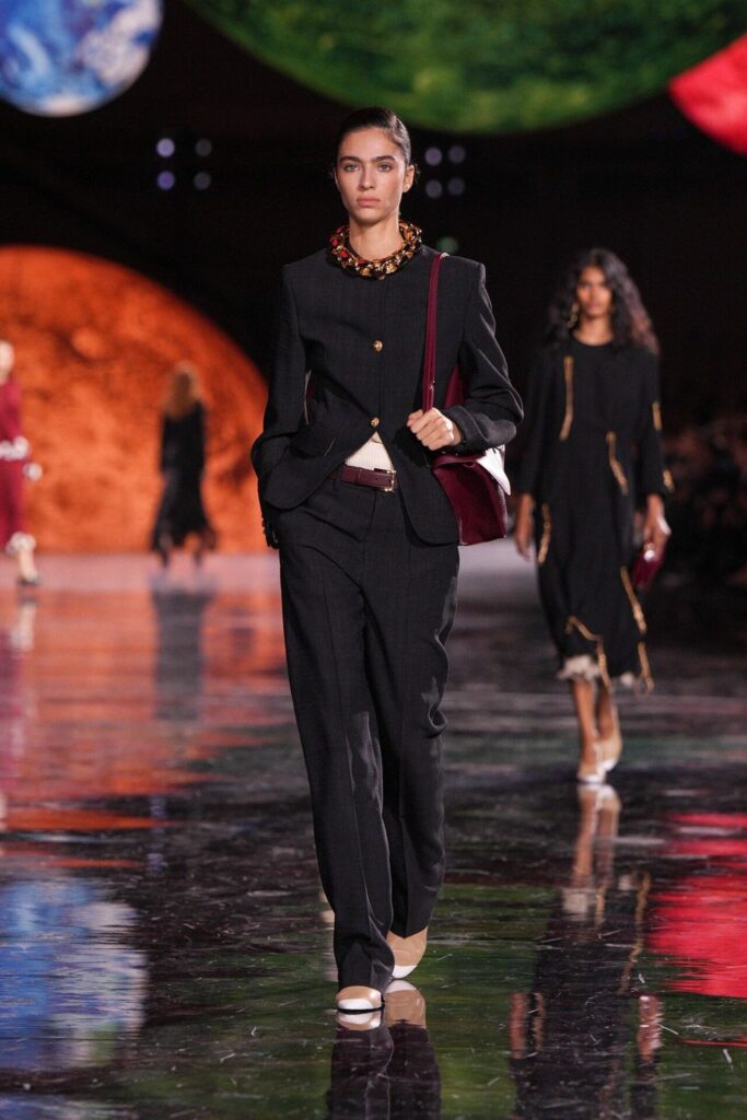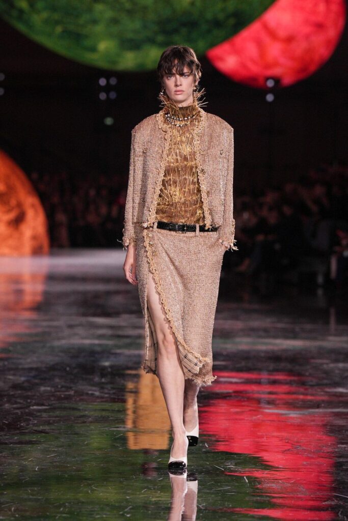 Paris Moda Haftası’nda Chanel, Matthieu Blazy’nin ilk koleksiyonuyla Grand Palais’i adeta galaktik bir sahneye dönüştürdü. Işık küreleri ve parlayan gezegenlerle aydınlanan atmosfer, markanın tarihindeki en önemli dönüşümlerden birine zemin hazırladı. Chanel’in 115 yıllık tarihinde direksiyona geçen dördüncü tasarımcı olan Blazy, mirasa hapsolmak yerine onu yeniden canlandırdı. Coco Chanel’in maskülen formlara olan sevgisini, jersey kumaşlarla özgürleşen siluetlerini ve hareket odaklı duruşunu modern bir bakışla yorumladı. Kısa pantolon takımlar, zincir ağırlıklı gömlekler ve akıcı formlar, markanın “konforla zarafet” dengesi üzerine kurulu yeni çağını başlattı.