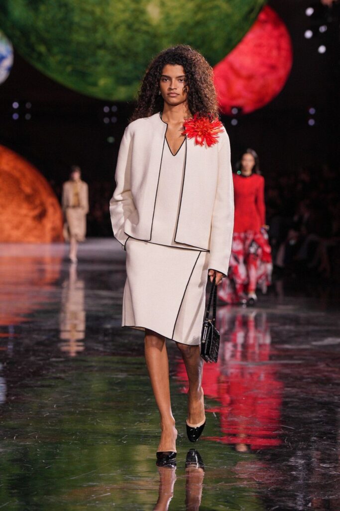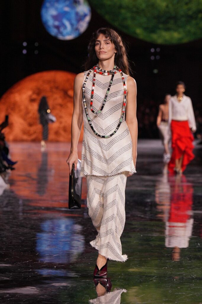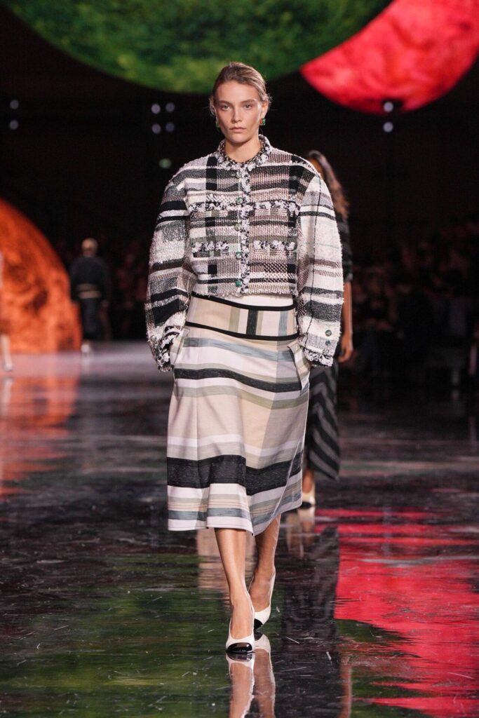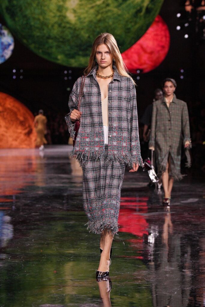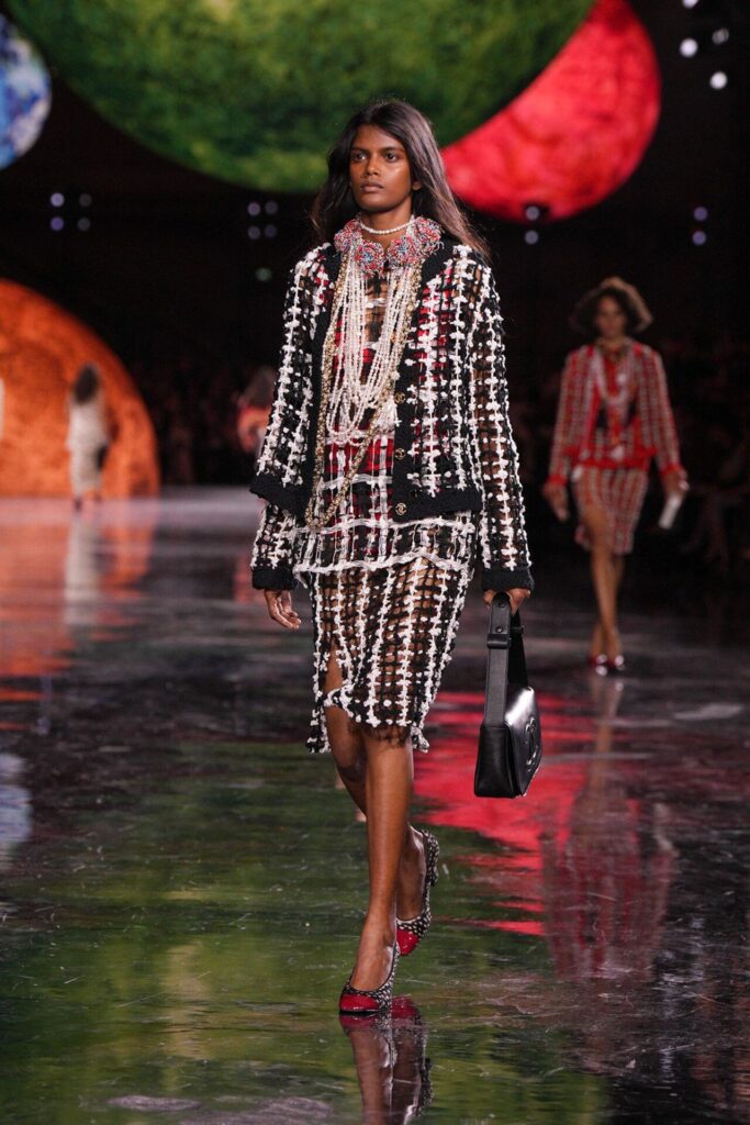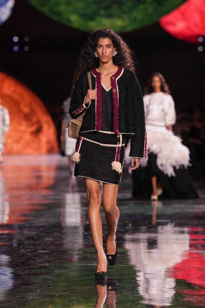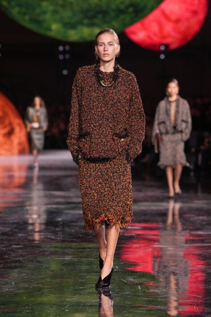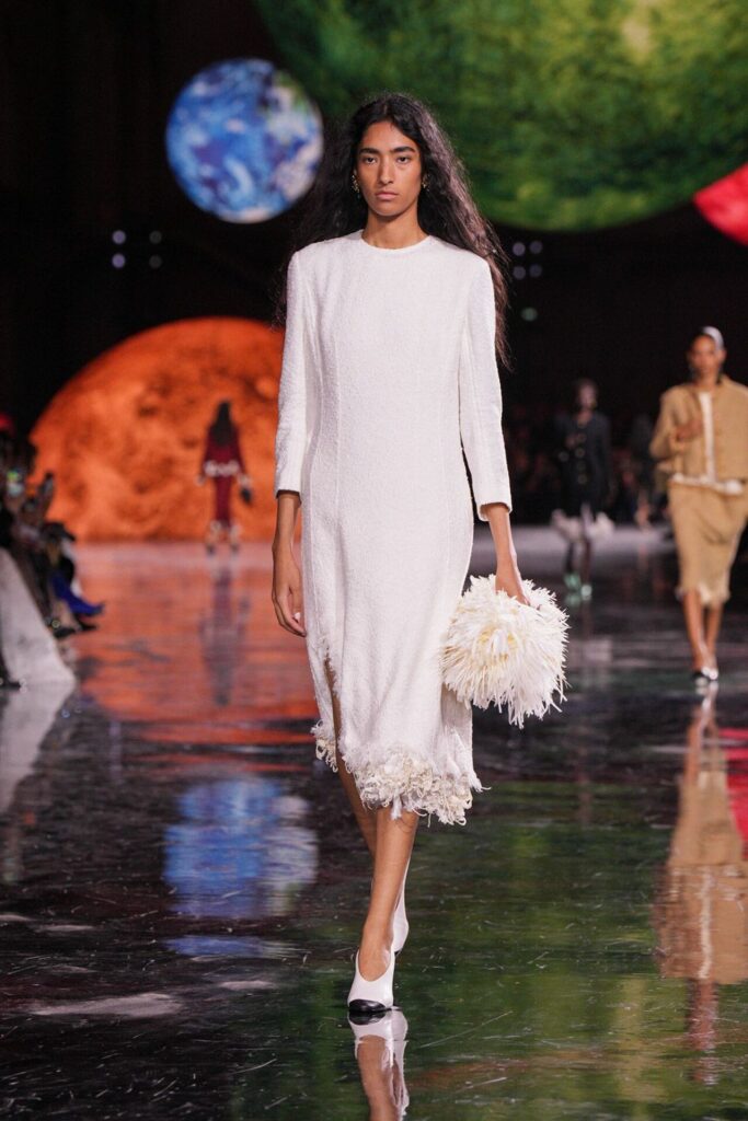 Paris Moda Haftası’nda Chanel, Matthieu Blazy’nin ilk koleksiyonuyla Grand Palais’i adeta galaktik bir sahneye dönüştürdü. Işık küreleri ve parlayan gezegenlerle aydınlanan atmosfer, markanın tarihindeki en önemli dönüşümlerden birine zemin hazırladı. Chanel’in 115 yıllık tarihinde direksiyona geçen dördüncü tasarımcı olan Blazy, mirasa hapsolmak yerine onu yeniden canlandırdı. Coco Chanel’in maskülen formlara olan sevgisini, jersey kumaşlarla özgürleşen siluetlerini ve hareket odaklı duruşunu modern bir bakışla yorumladı. Kısa pantolon takımlar, zincir ağırlıklı gömlekler ve akıcı formlar, markanın “konforla zarafet” dengesi üzerine kurulu yeni çağını başlattı.