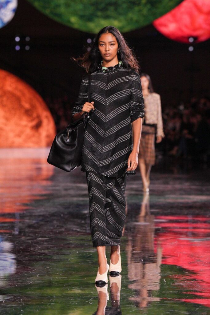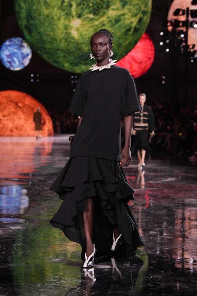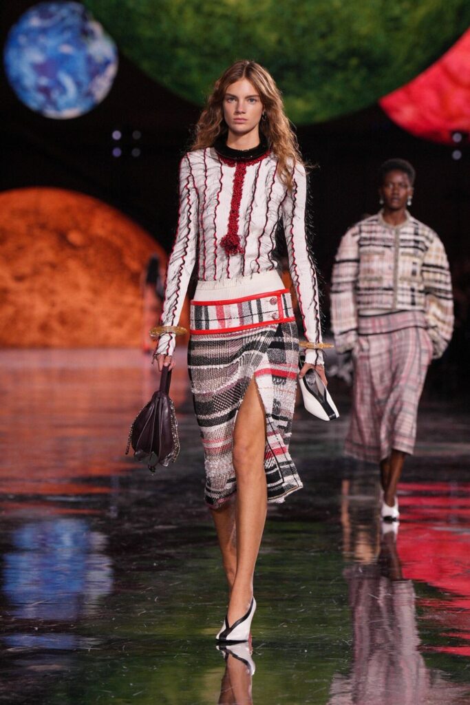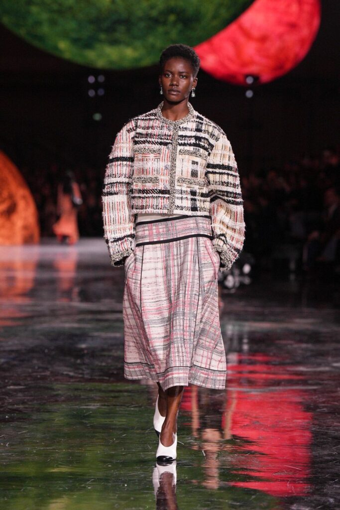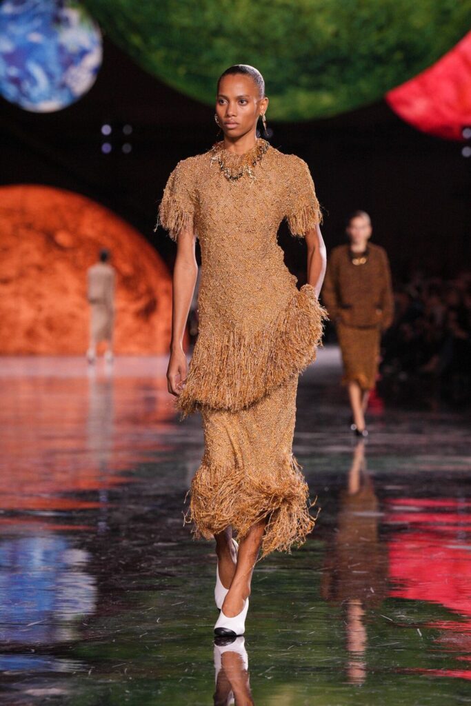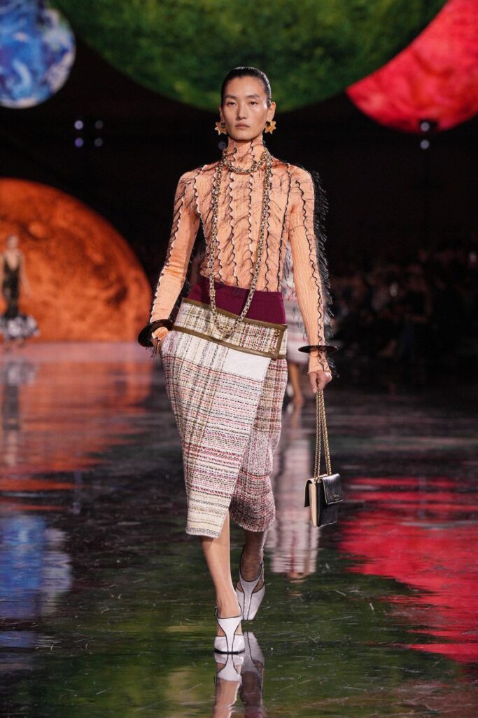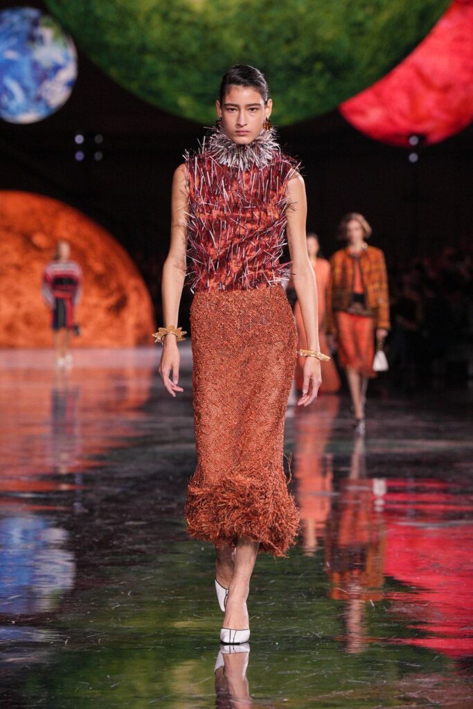 Paris Moda Haftası’nda Chanel, Matthieu Blazy’nin ilk koleksiyonuyla Grand Palais’i adeta galaktik bir sahneye dönüştürdü. Işık küreleri ve parlayan gezegenlerle aydınlanan atmosfer, markanın tarihindeki en önemli dönüşümlerden birine zemin hazırladı. Chanel’in 115 yıllık tarihinde direksiyona geçen dördüncü tasarımcı olan Blazy, mirasa hapsolmak yerine onu yeniden canlandırdı. Coco Chanel’in maskülen formlara olan sevgisini, jersey kumaşlarla özgürleşen siluetlerini ve hareket odaklı duruşunu modern bir bakışla yorumladı. Kısa pantolon takımlar, zincir ağırlıklı gömlekler ve akıcı formlar, markanın “konforla zarafet” dengesi üzerine kurulu yeni çağını başlattı.