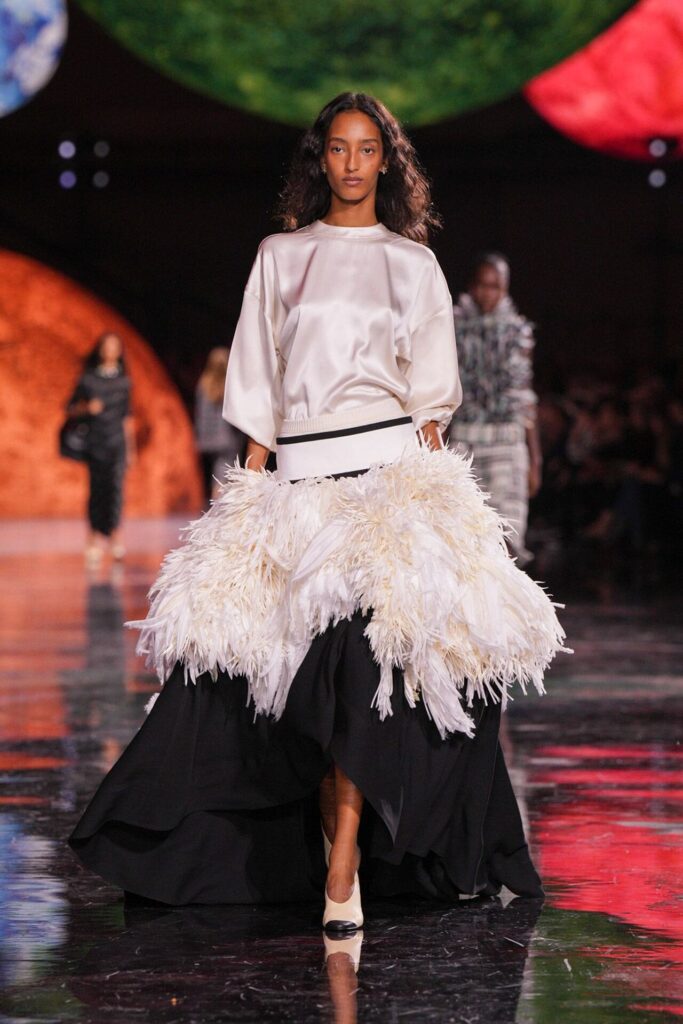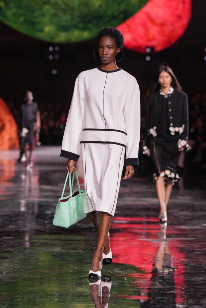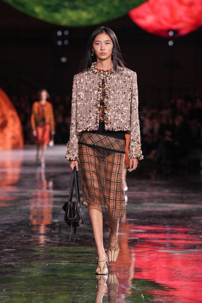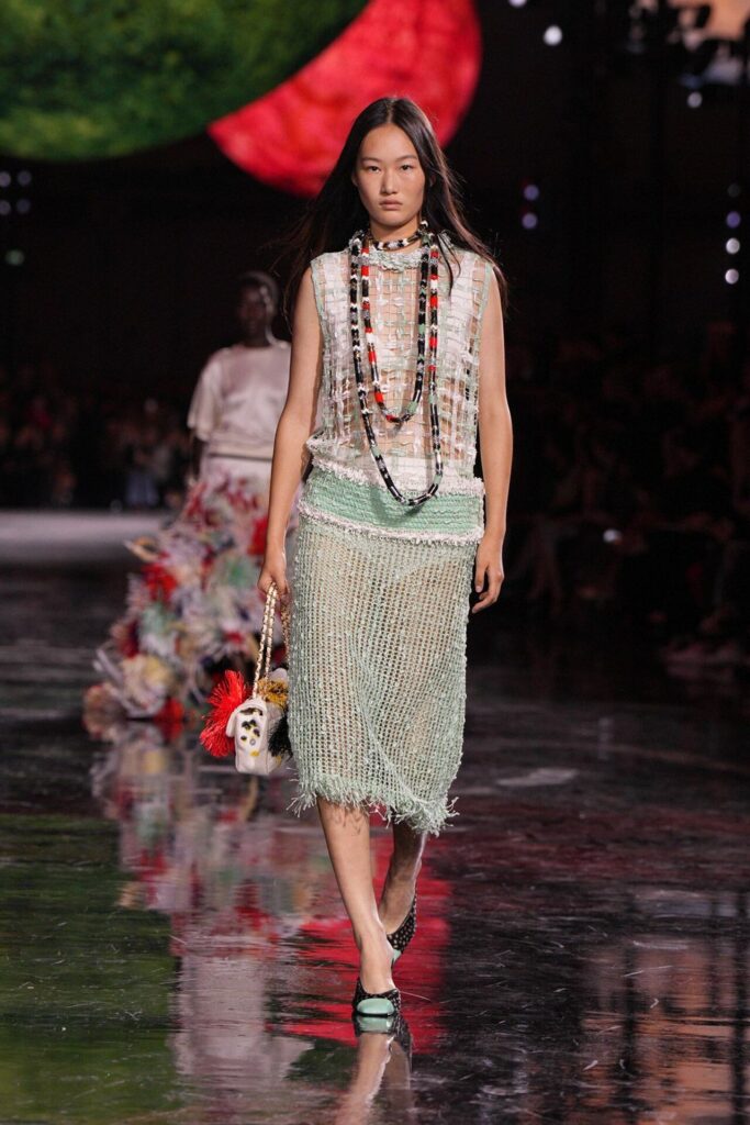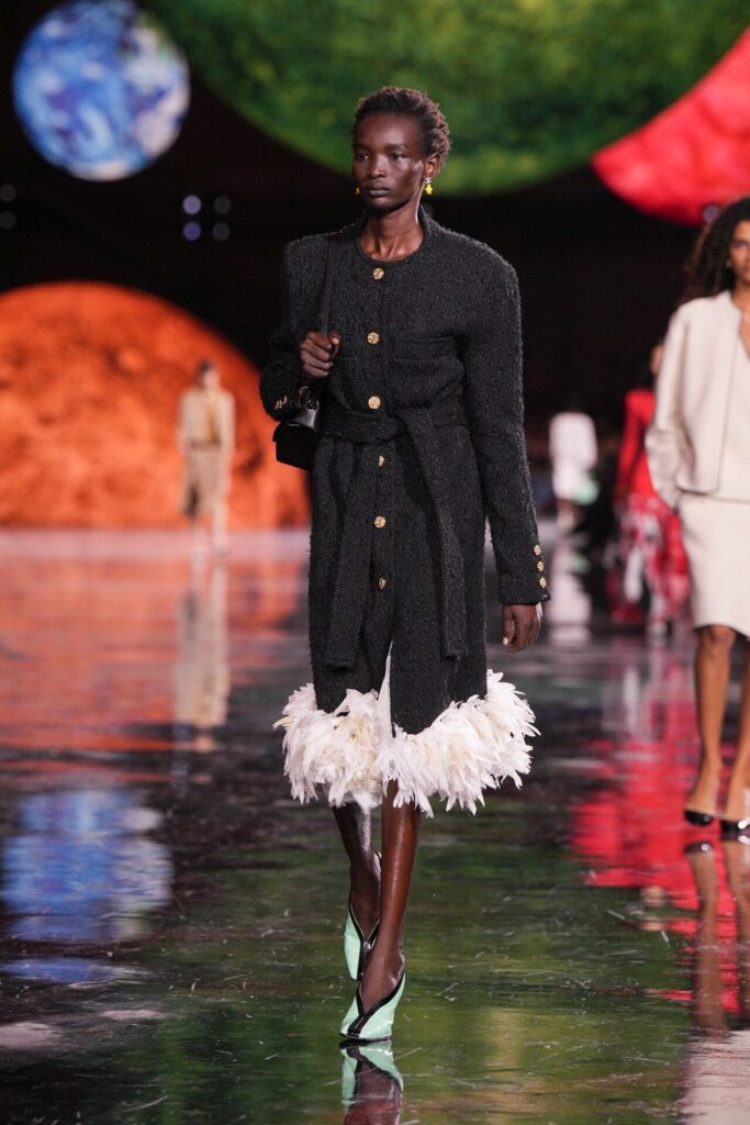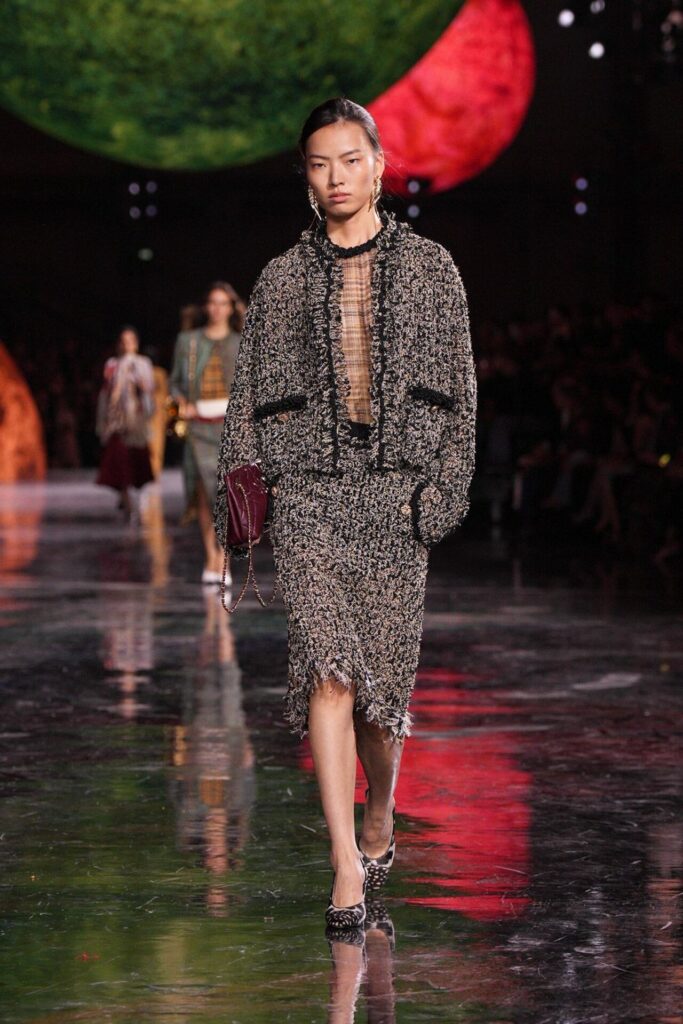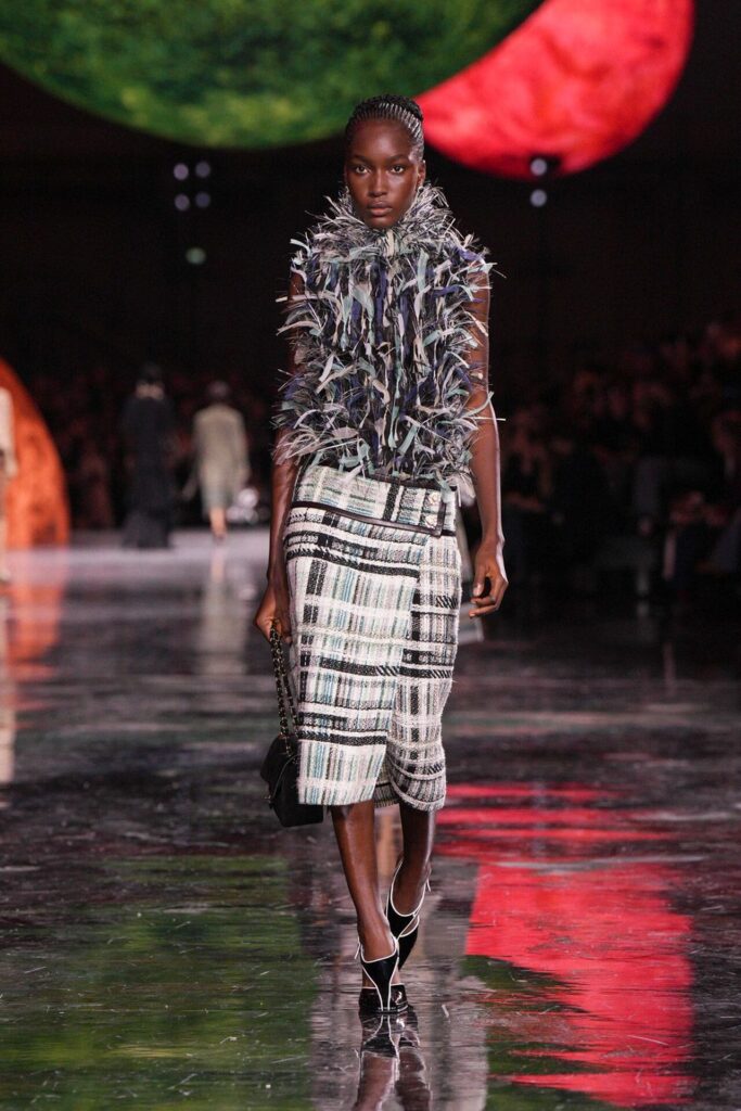Blazy’nin malzeme ustalığı, Bottega Veneta döneminden taşıdığı yenilikçi ruhla Chanel’de de hayat buldu. Geleneksel tweed kumaşlar viskon karışımlarla hafifletilerek canlı bir dinamizm kazandı; örgü V-yaka kazaklar, kamelya işlemeli saten eteklerle tamamlanarak günlük şıklığı yeniden tanımladı. Efsanevi 2.55 çanta, esneyebilen tel yapısıyla “zamansız ama yaşayan” bir hikâyeye dönüştü. Defilenin kapanışında saten tişörtlerle tüy etekler birleştiğinde, Chanel’in geçmişiyle bugünü arasındaki diyalog yeniden yazıldı. Spring Summer 2026, Chanel’in köklü zarafetini çağdaş bir özgürlükle buluşturarak modada yeni bir sayfa açtı.