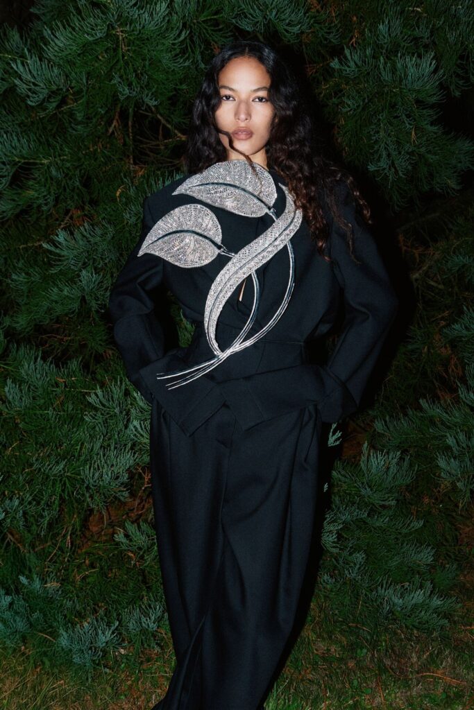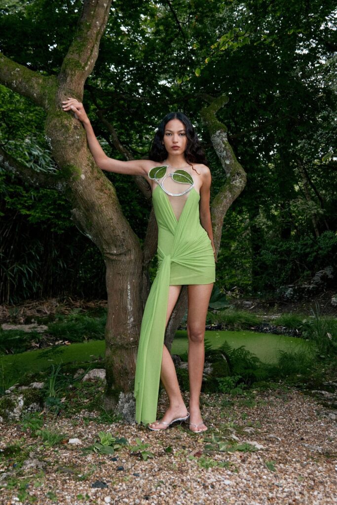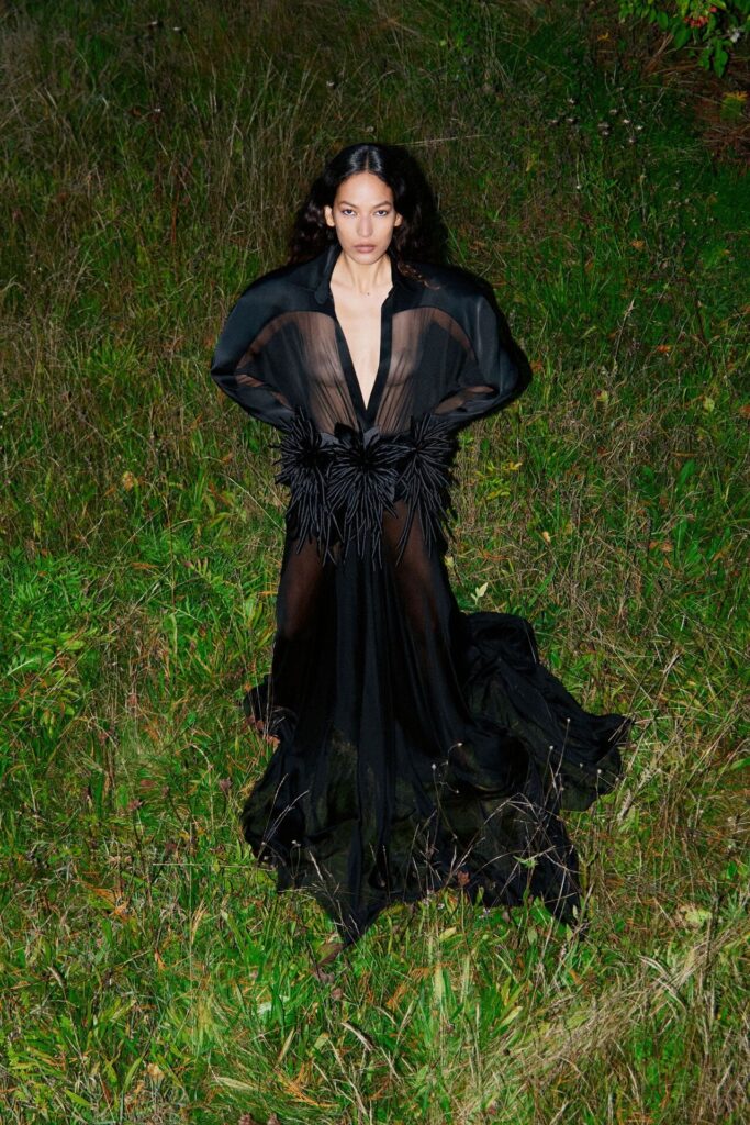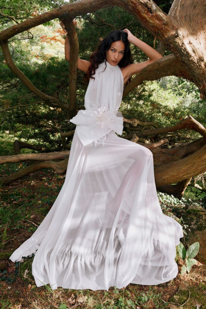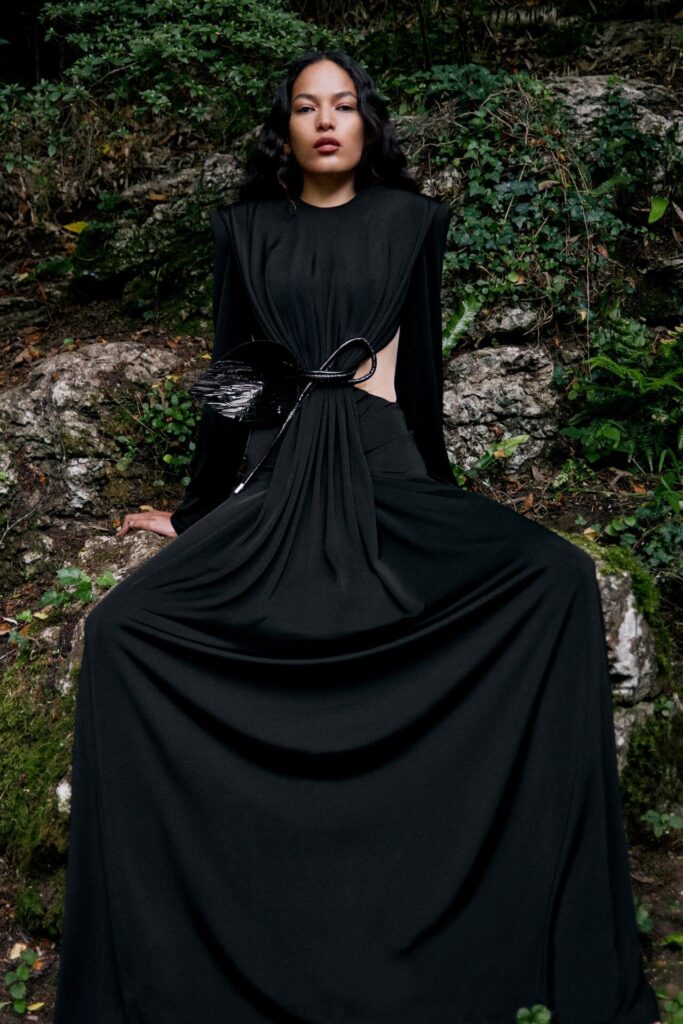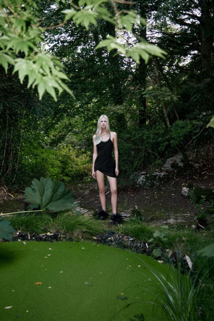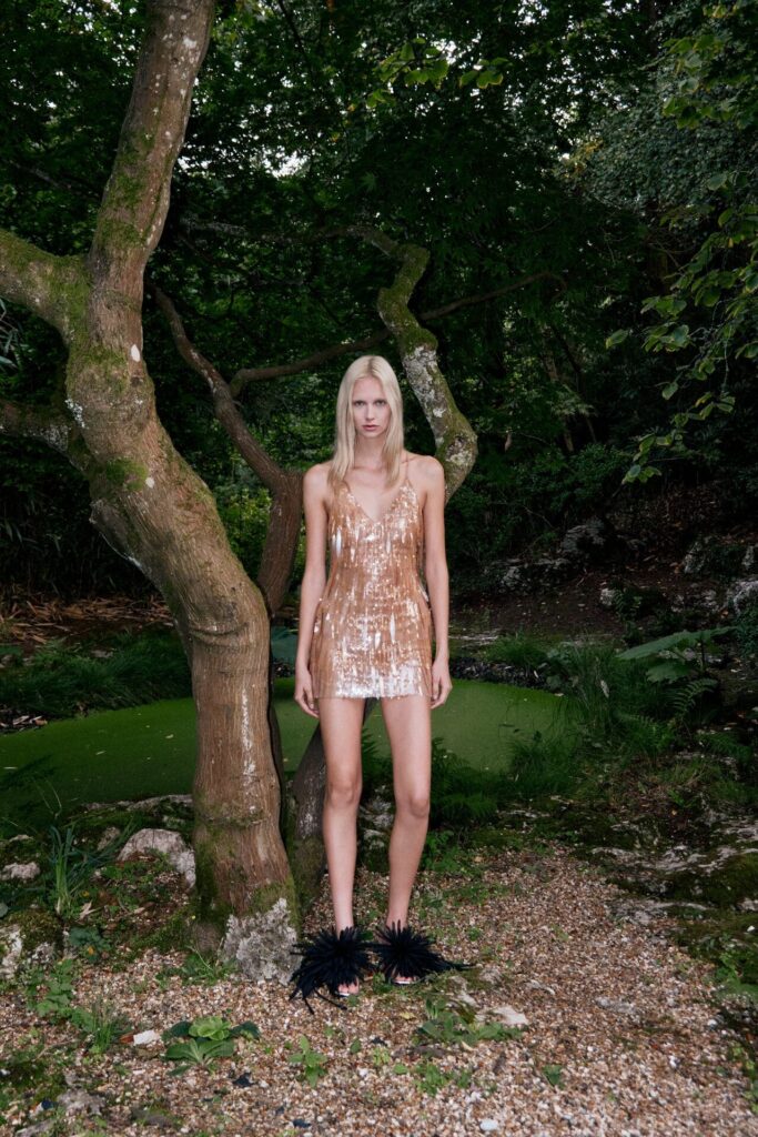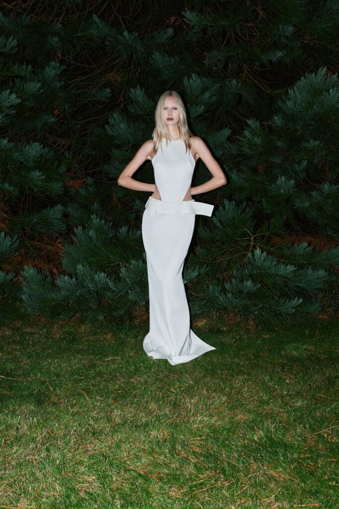 David Koma Spring Summer 2026 lookbook’u, pastoral Surrey Hills’den yola çıkarak karanlık bir masal atmosferine evrildi. Doğayla çevrili bu sahnede Koma, feminen cazibeyi tehlike ve baştan çıkarıcılıkla harmanladı. Geometrik hatlara sahip straplez elbiseler ve keskin silüetler, ipek şifon trenler ve dramatik saten eteklerle yumuşatılarak modern kulüp referanslarıyla folklorik dokuların buluştuğu çarpıcı bir kontrast oluşturdu.