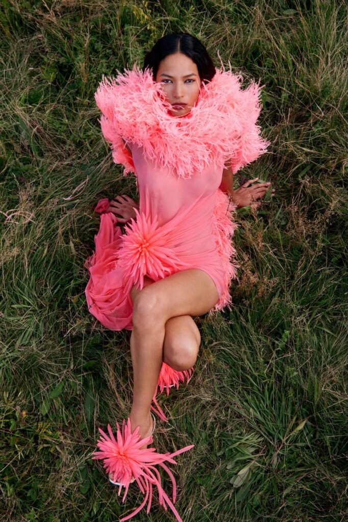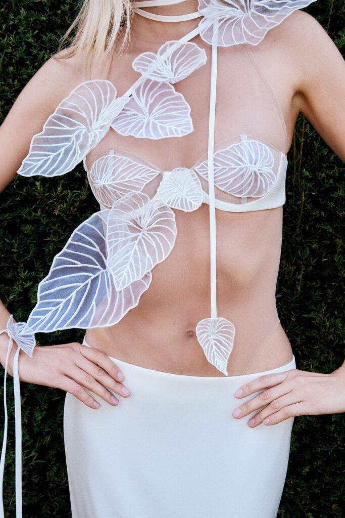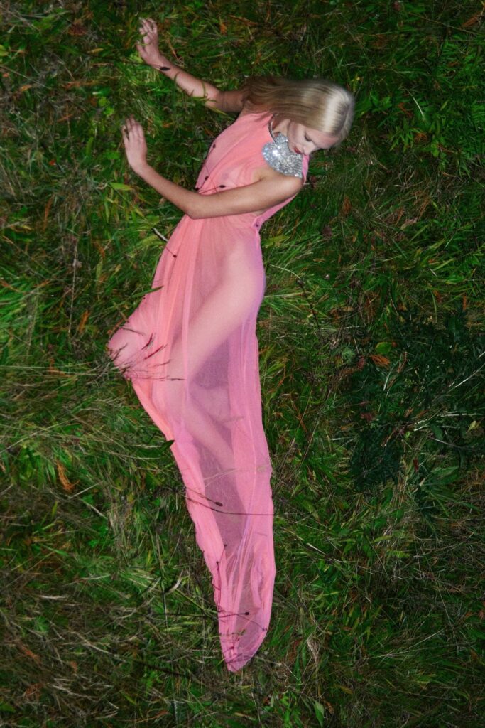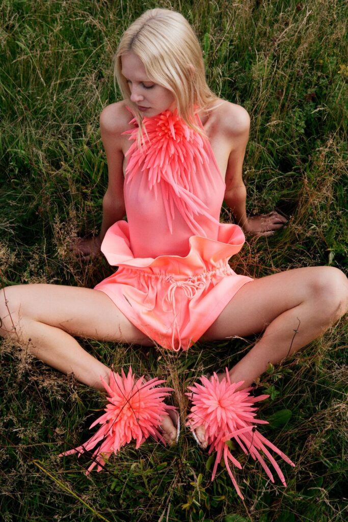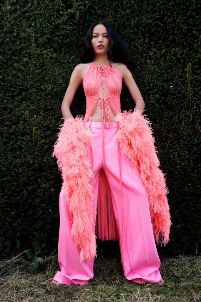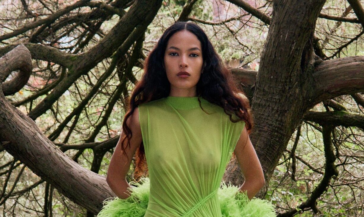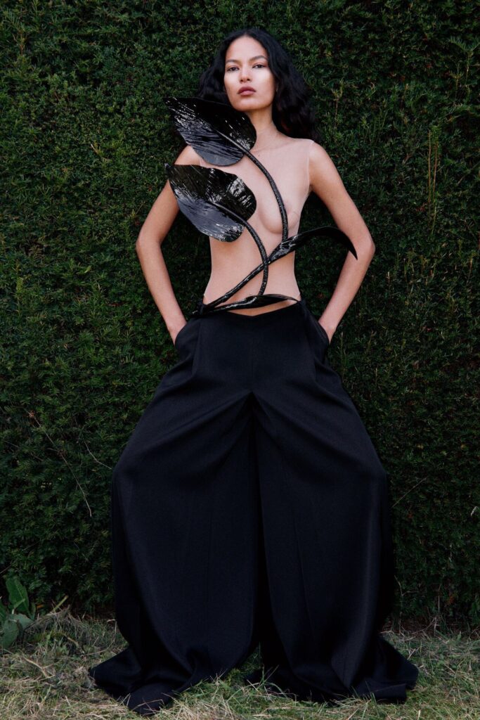 David Koma Spring Summer 2026 lookbook’u, pastoral Surrey Hills’den yola çıkarak karanlık bir masal atmosferine evrildi. Doğayla çevrili bu sahnede Koma, feminen cazibeyi tehlike ve baştan çıkarıcılıkla harmanladı. Geometrik hatlara sahip straplez elbiseler ve keskin silüetler, ipek şifon trenler ve dramatik saten eteklerle yumuşatılarak modern kulüp referanslarıyla folklorik dokuların buluştuğu çarpıcı bir kontrast oluşturdu.