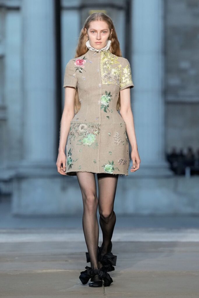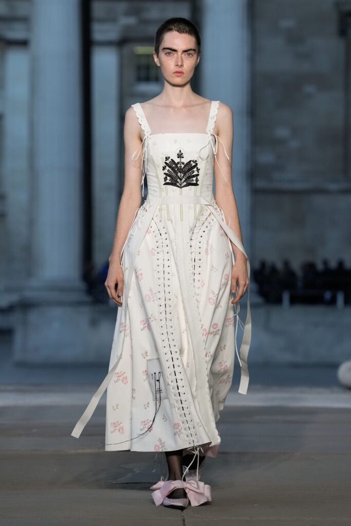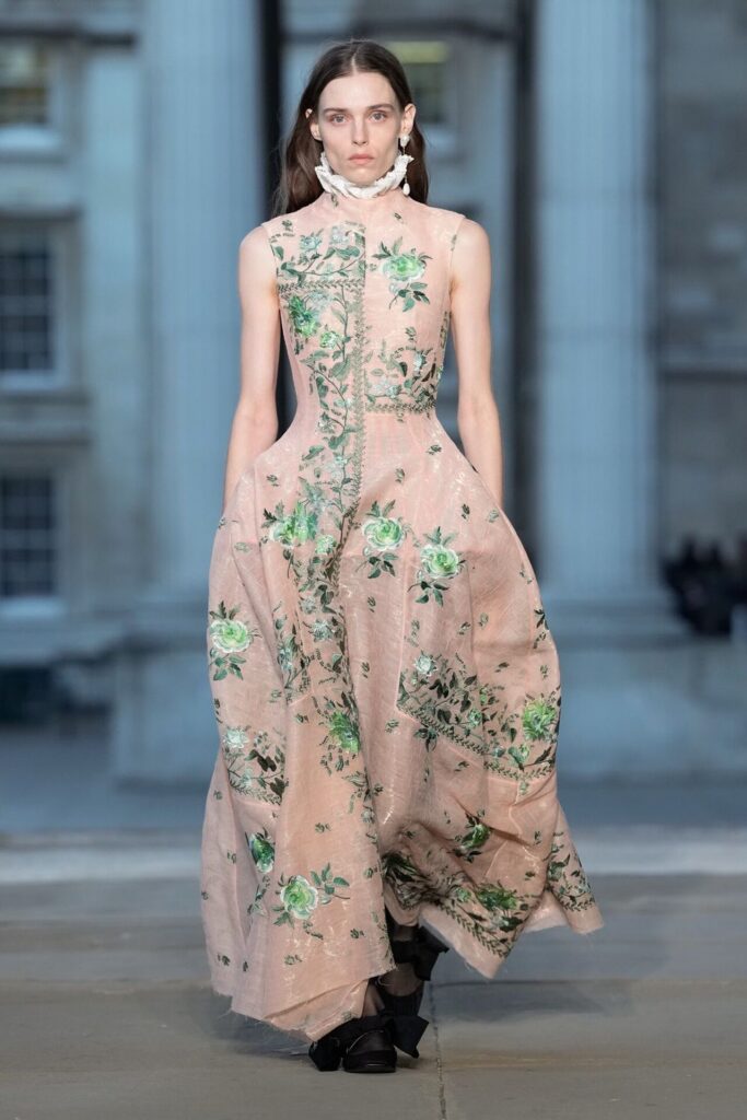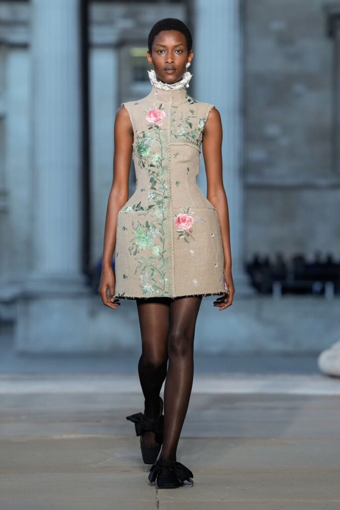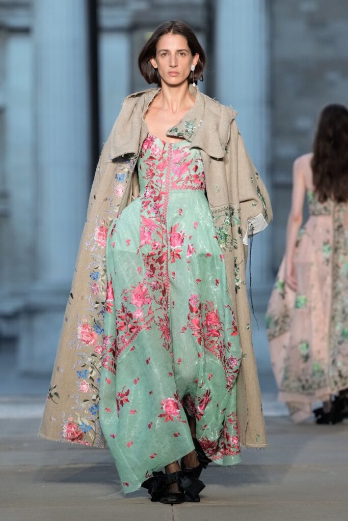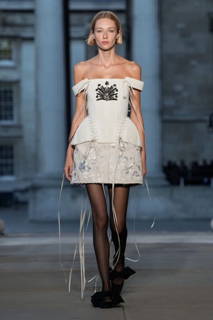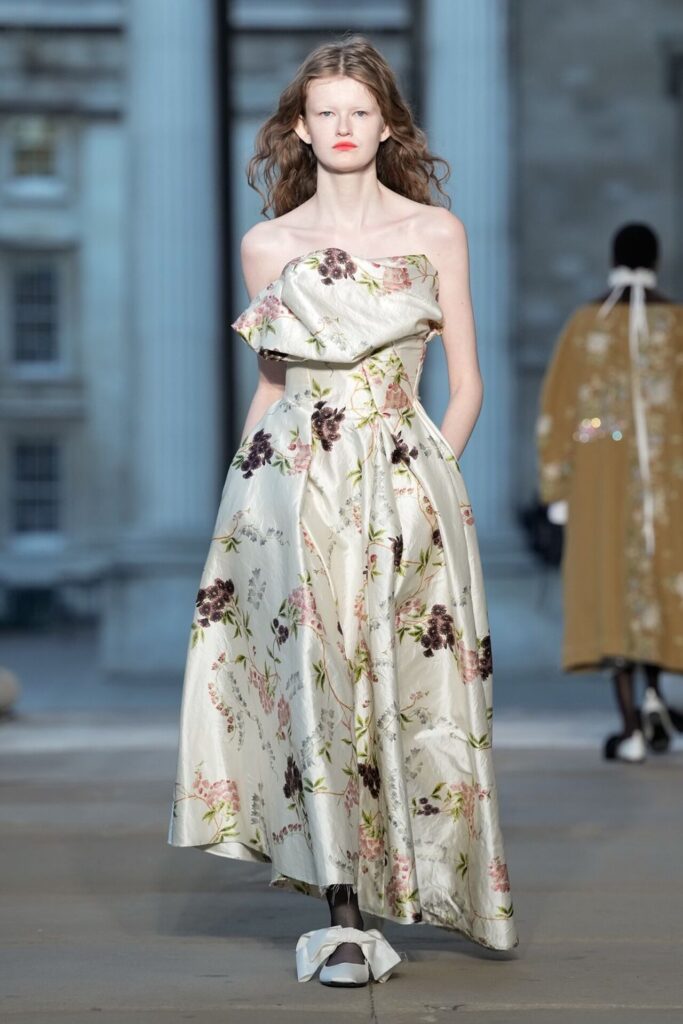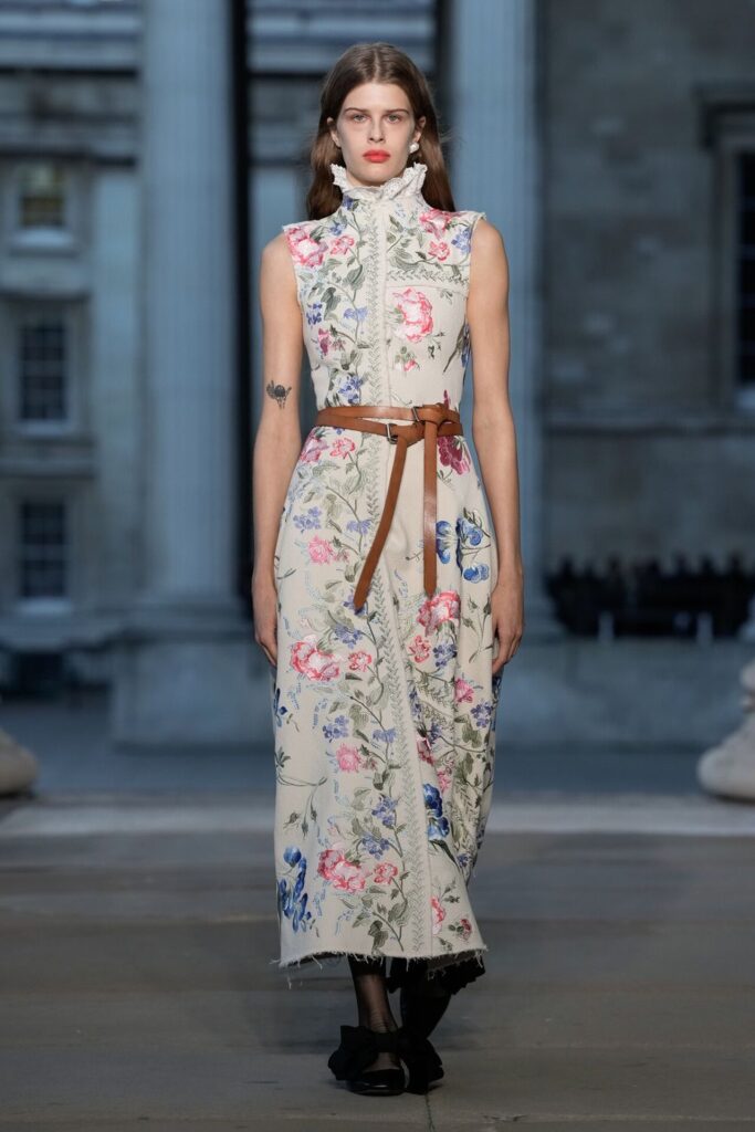 Defilede Erdem’in imza estetiği yeni formlarla gelişti: Korse detaylı elbiseler, hafif beyaz pantolonlarla kombinlenen keskin ceketler ve floral desenler öne çıktı. Şeffaf Viktoryen bluzlar, pileli etekler ve yatak odası zarafetini sokağa taşıyan sabahlık formlarındaki tasarımlar koleksiyonun farklı yönlerini ortaya koydu.
