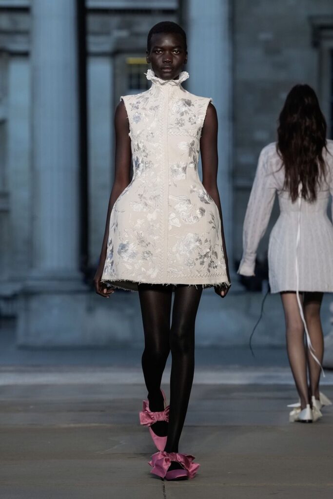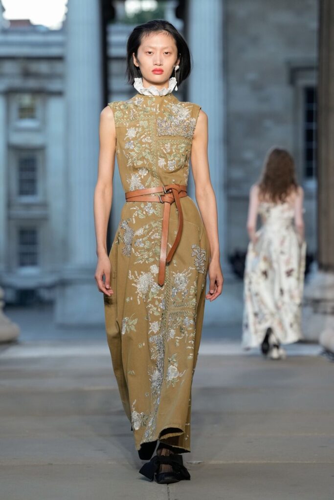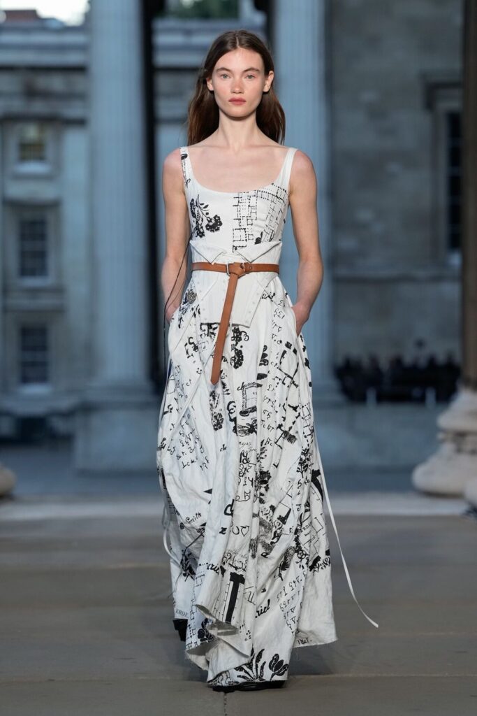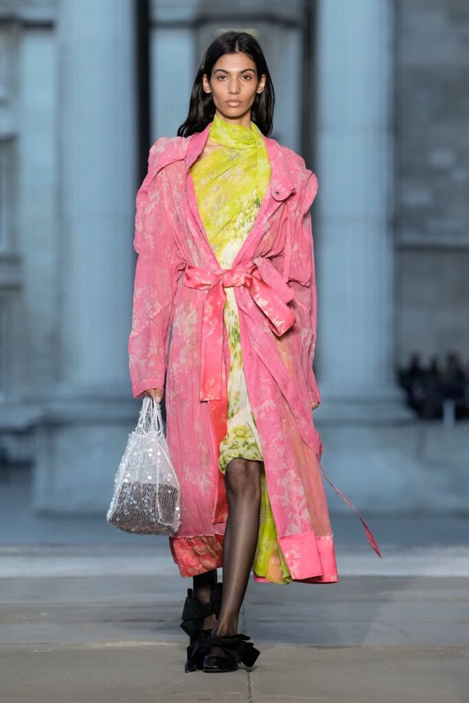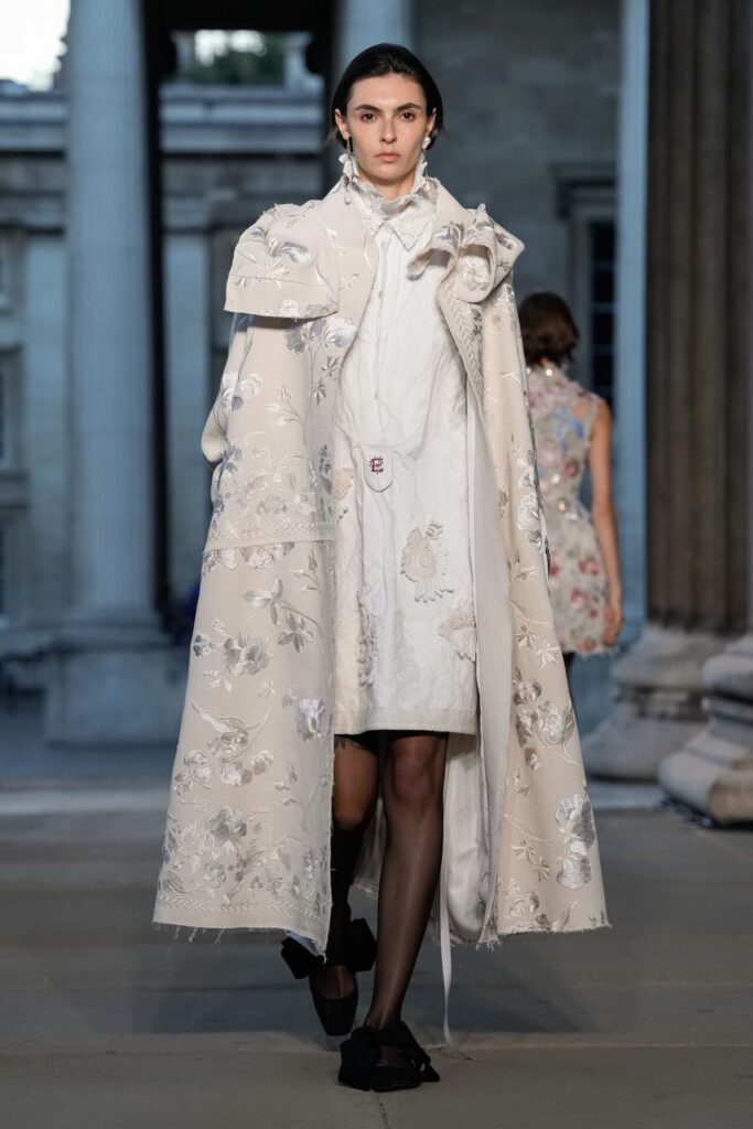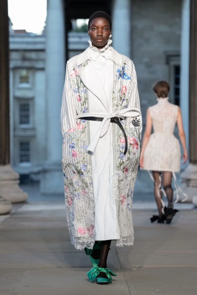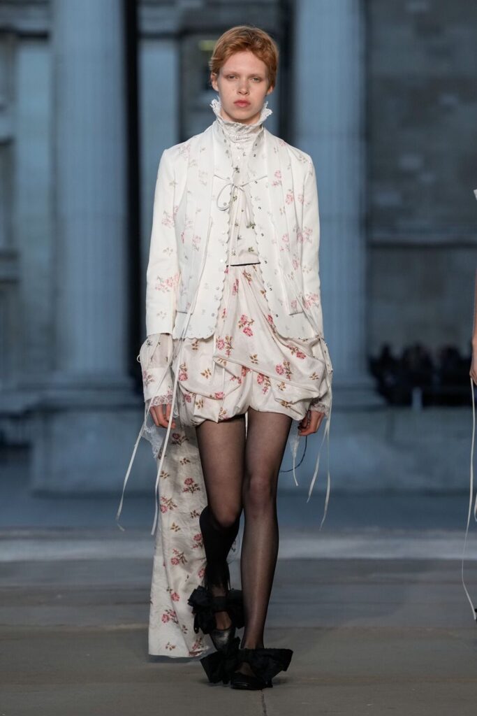Defilede Erdem’in imza estetiği yeni formlarla gelişti: Korse detaylı elbiseler, hafif beyaz pantolonlarla kombinlenen keskin ceketler ve floral desenler öne çıktı. Şeffaf Viktoryen bluzlar, pileli etekler ve yatak odası zarafetini sokağa taşıyan sabahlık formlarındaki tasarımlar koleksiyonun farklı yönlerini ortaya koydu.