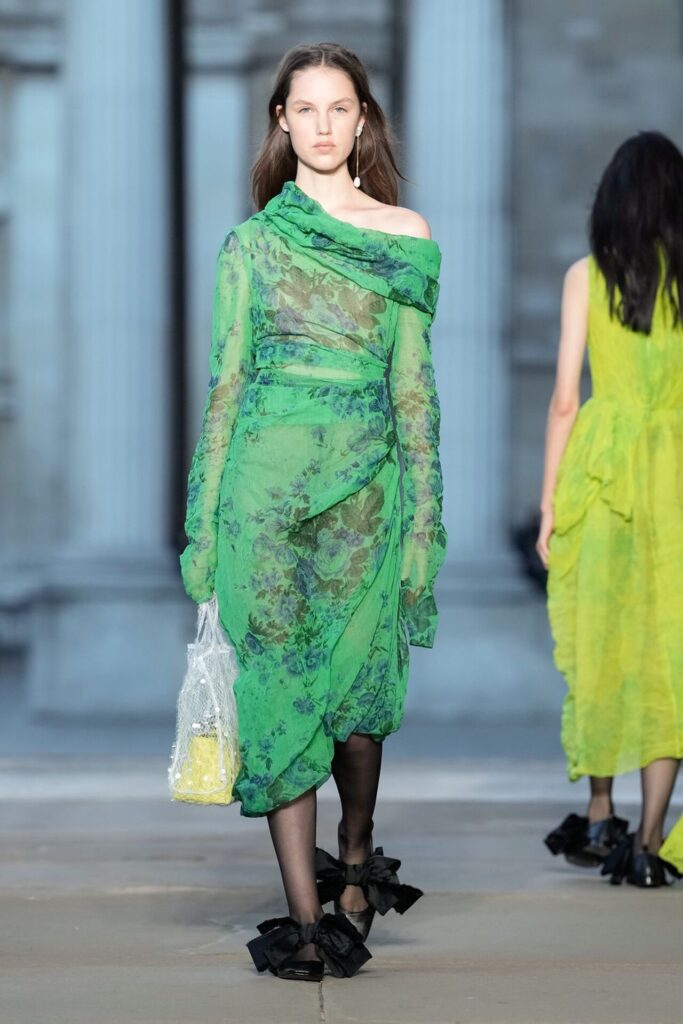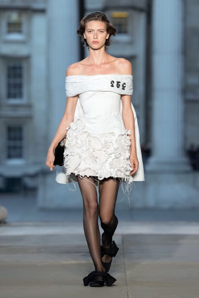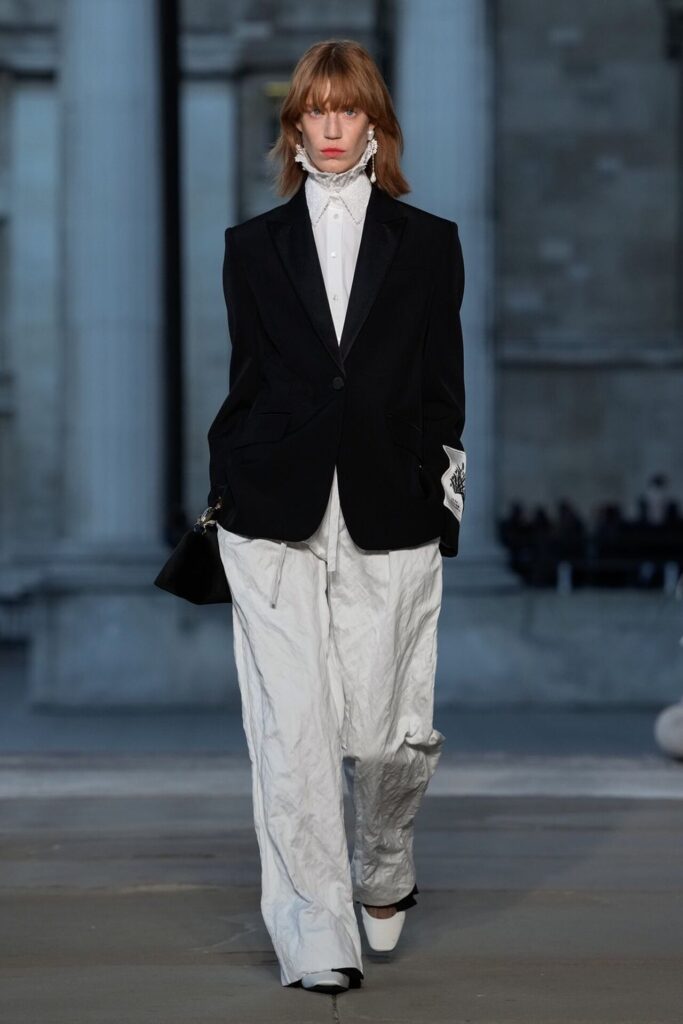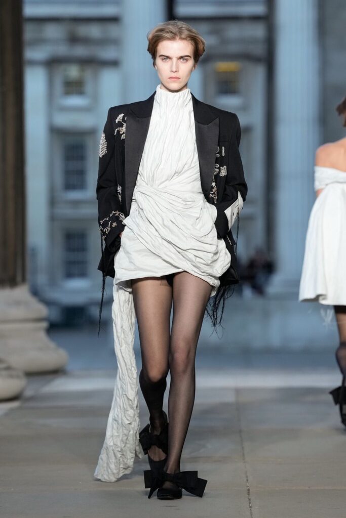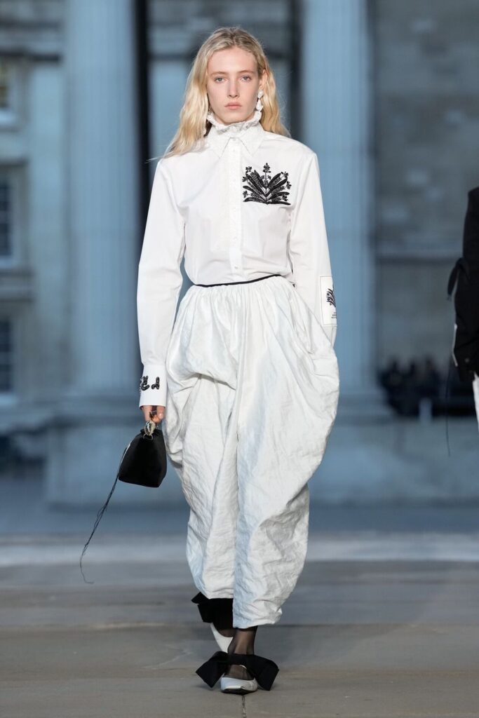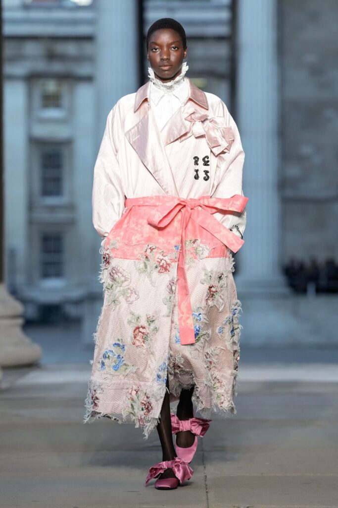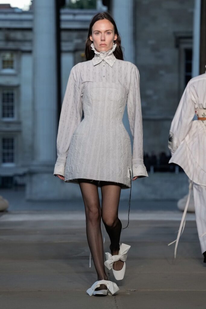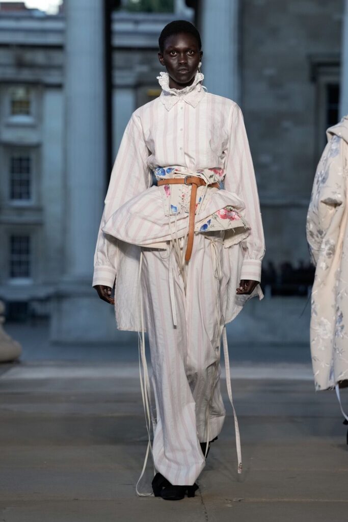 Defilede Erdem’in imza estetiği yeni formlarla gelişti: Korse detaylı elbiseler, hafif beyaz pantolonlarla kombinlenen keskin ceketler ve floral desenler öne çıktı. Şeffaf Viktoryen bluzlar, pileli etekler ve yatak odası zarafetini sokağa taşıyan sabahlık formlarındaki tasarımlar koleksiyonun farklı yönlerini ortaya koydu.