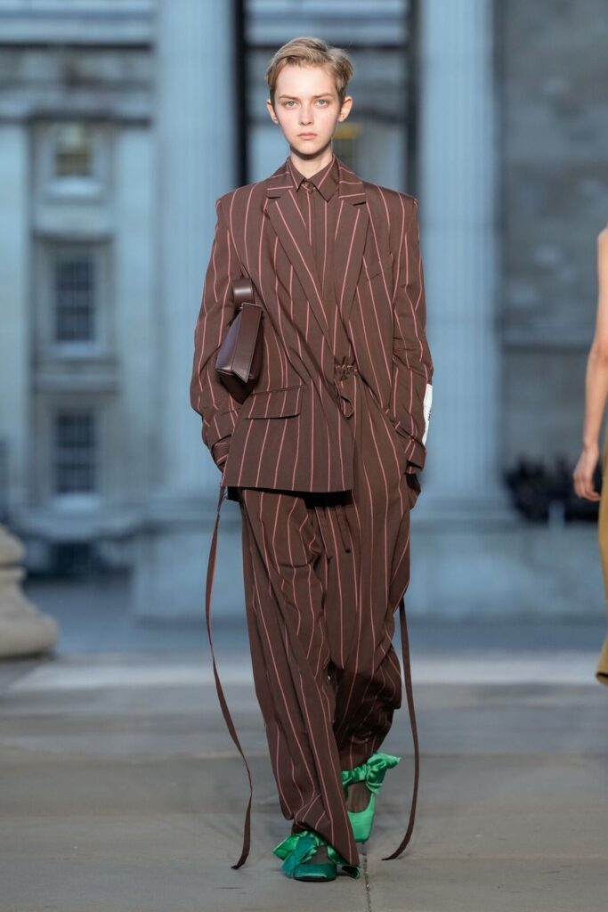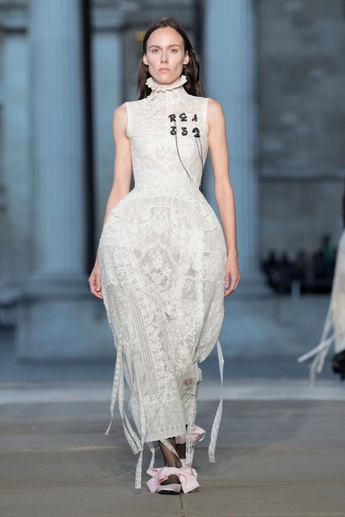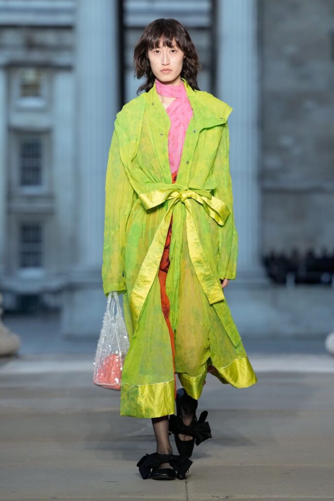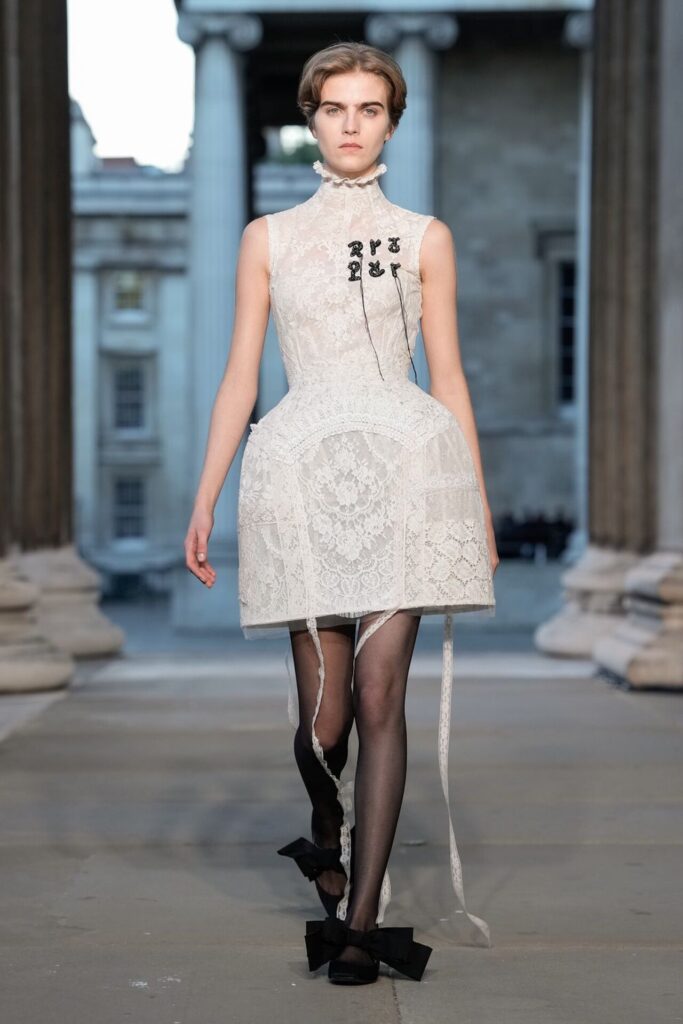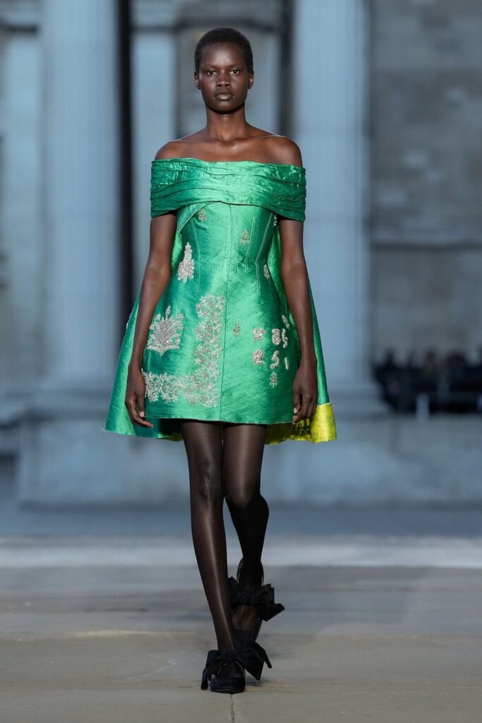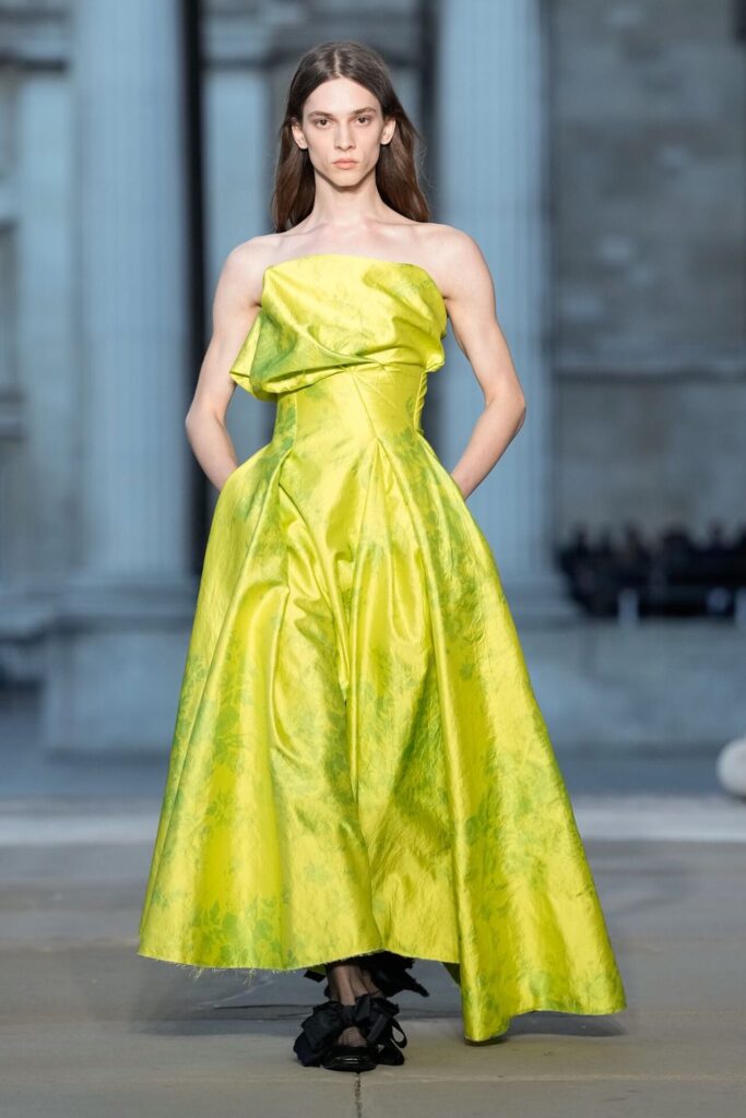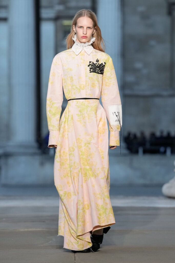 Defilede Erdem’in imza estetiği yeni formlarla gelişti: Korse detaylı elbiseler, hafif beyaz pantolonlarla kombinlenen keskin ceketler ve floral desenler öne çıktı. Şeffaf Viktoryen bluzlar, pileli etekler ve yatak odası zarafetini sokağa taşıyan sabahlık formlarındaki tasarımlar koleksiyonun farklı yönlerini ortaya koydu.