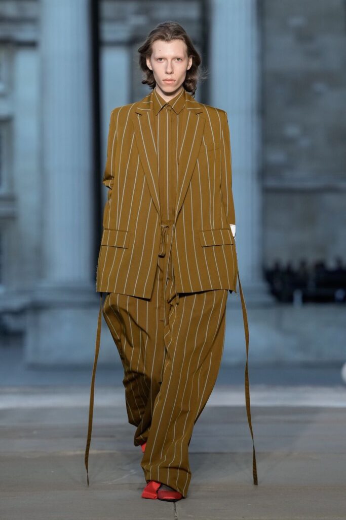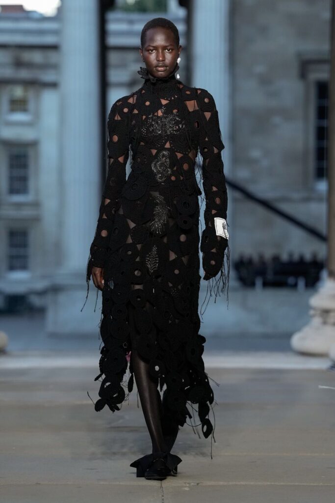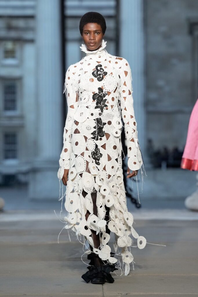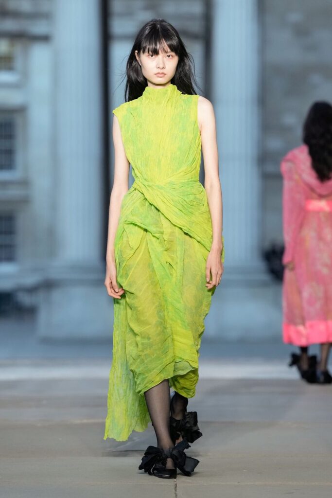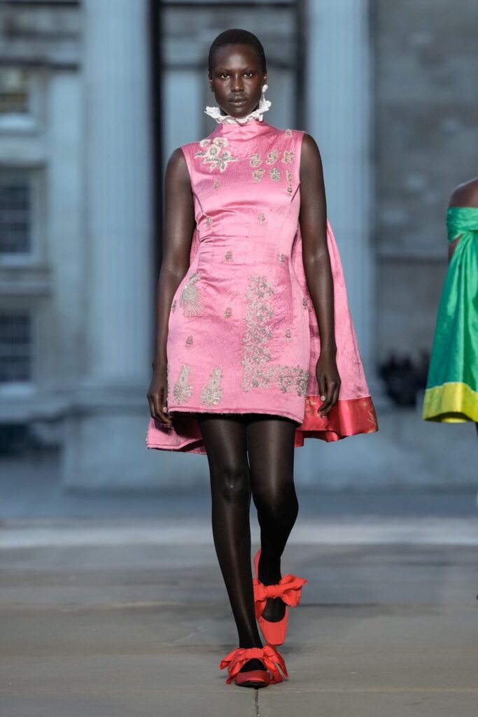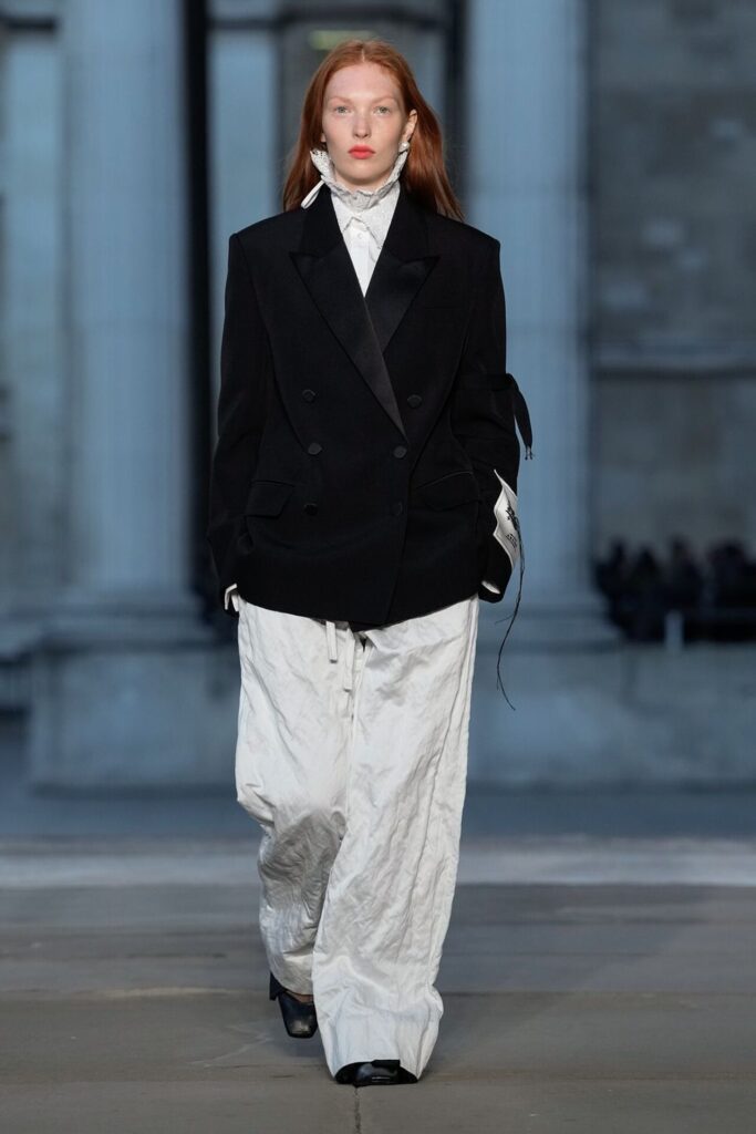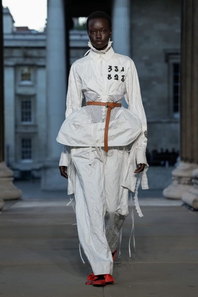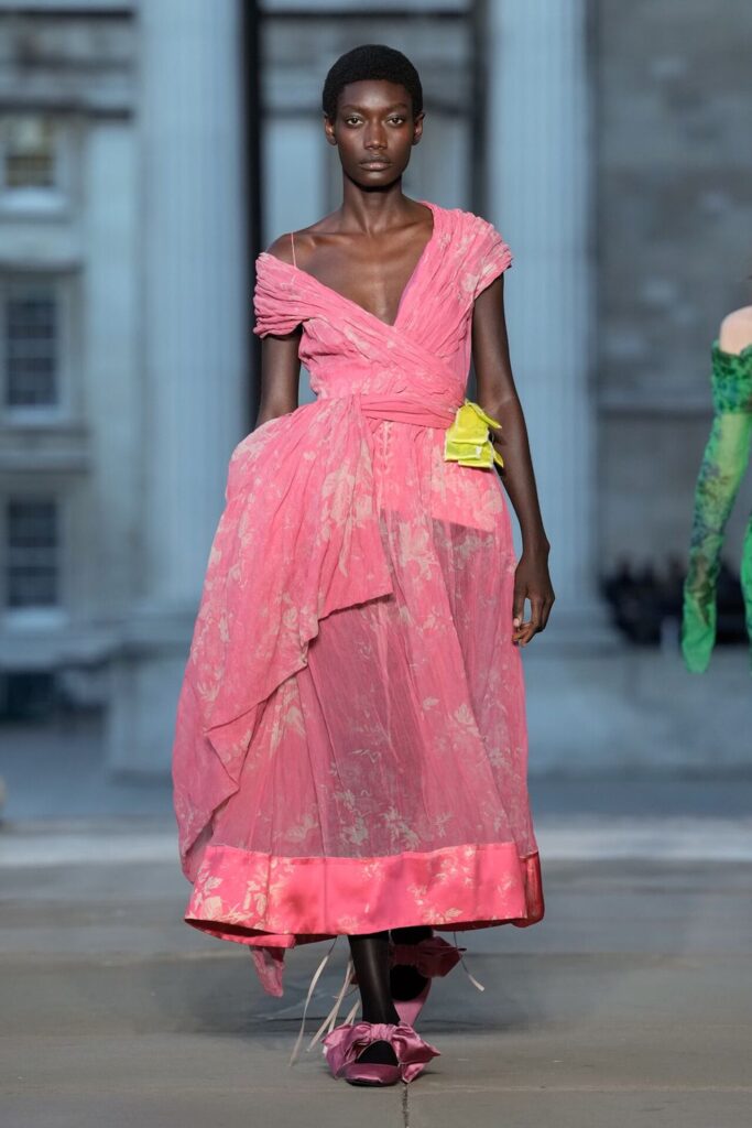 Defilede Erdem’in imza estetiği yeni formlarla gelişti: Korse detaylı elbiseler, hafif beyaz pantolonlarla kombinlenen keskin ceketler ve floral desenler öne çıktı. Şeffaf Viktoryen bluzlar, pileli etekler ve yatak odası zarafetini sokağa taşıyan sabahlık formlarındaki tasarımlar koleksiyonun farklı yönlerini ortaya koydu.