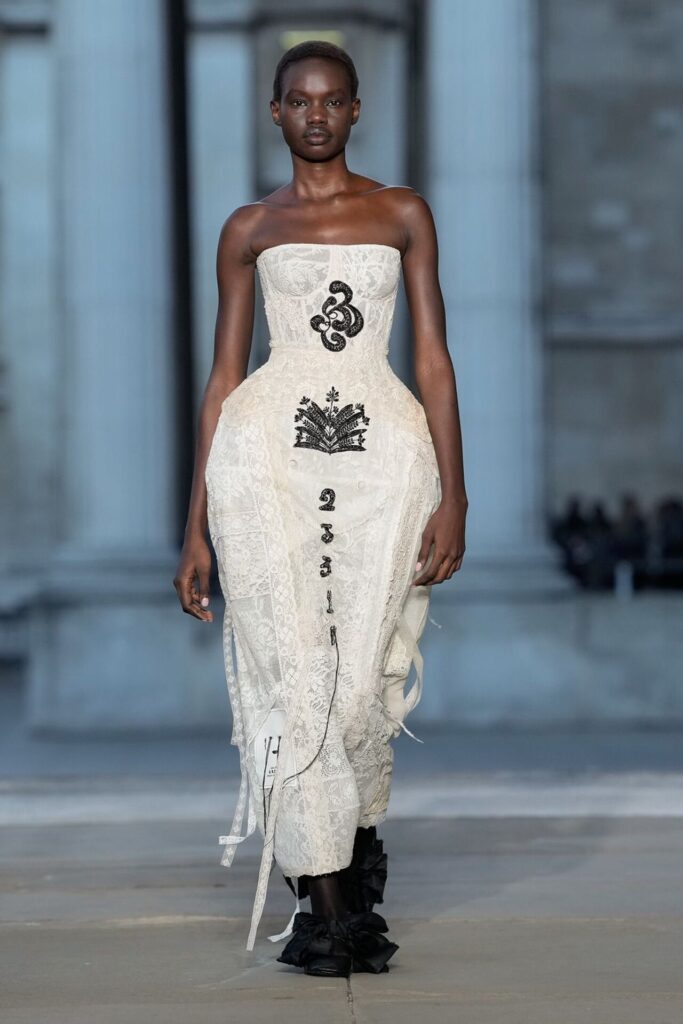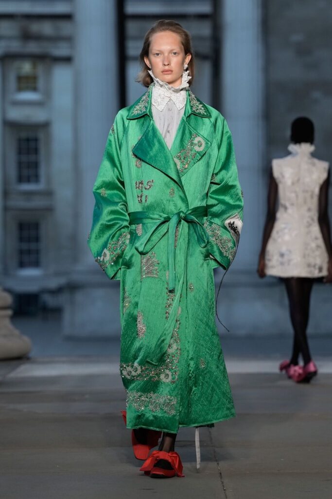 Kendi adını taşıyan markasının 20. yılında Erdem Moralıoğlu, Spring/Summer 2026 koleksiyonuyla zarafet ve eksantrikliğin uyumlu bir şekilde bir arada var olabileceğini kanıtladı. İlhamını 19. yüzyılın sonlarında yaşayan İsviçreli medyum Hélène Smith’in geçmiş yaşam hikayelerinden alan tasarımcı, onun çizimlerini ve yazılarını zarif nakışlarla ceket ve eteklere taşıdı.