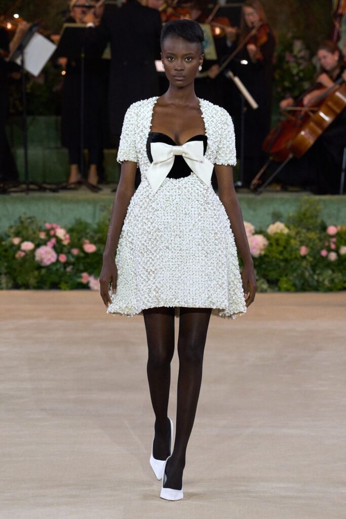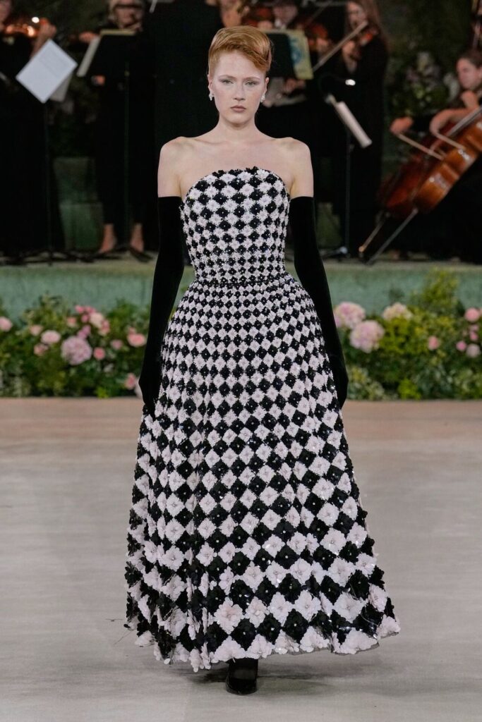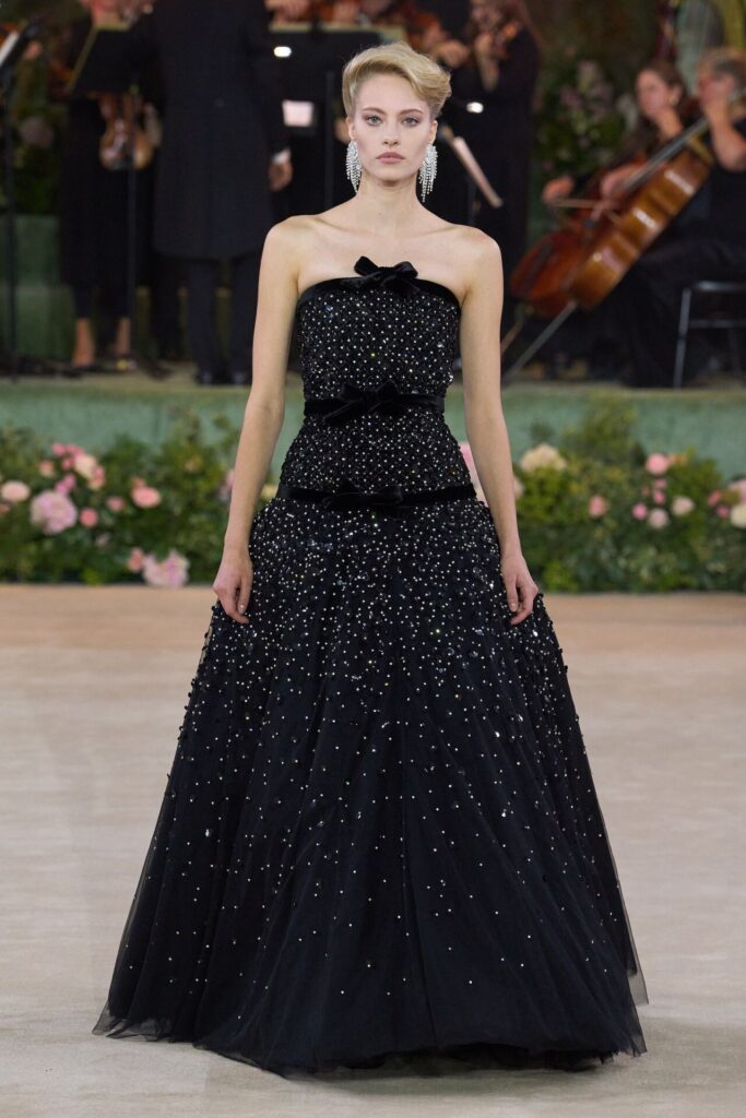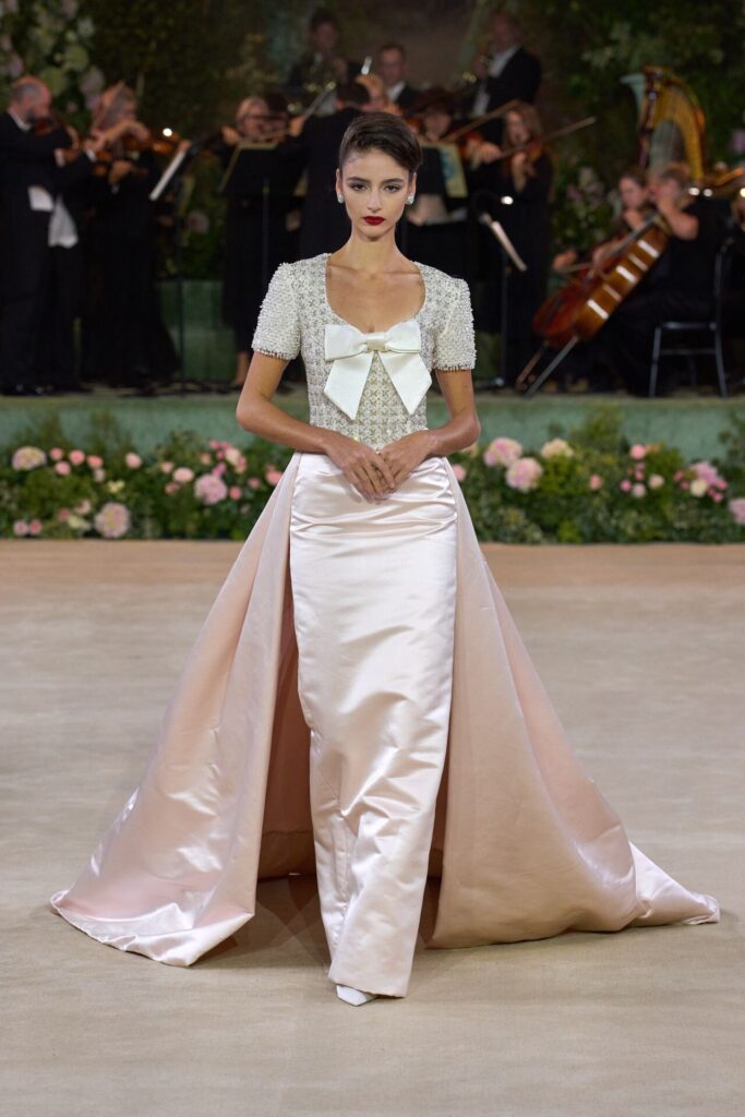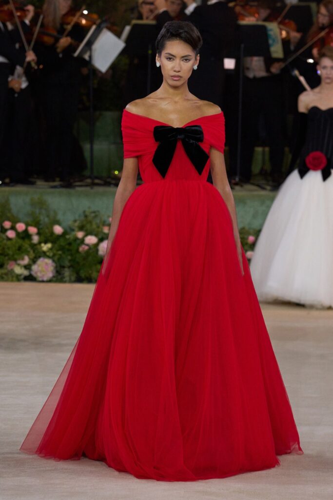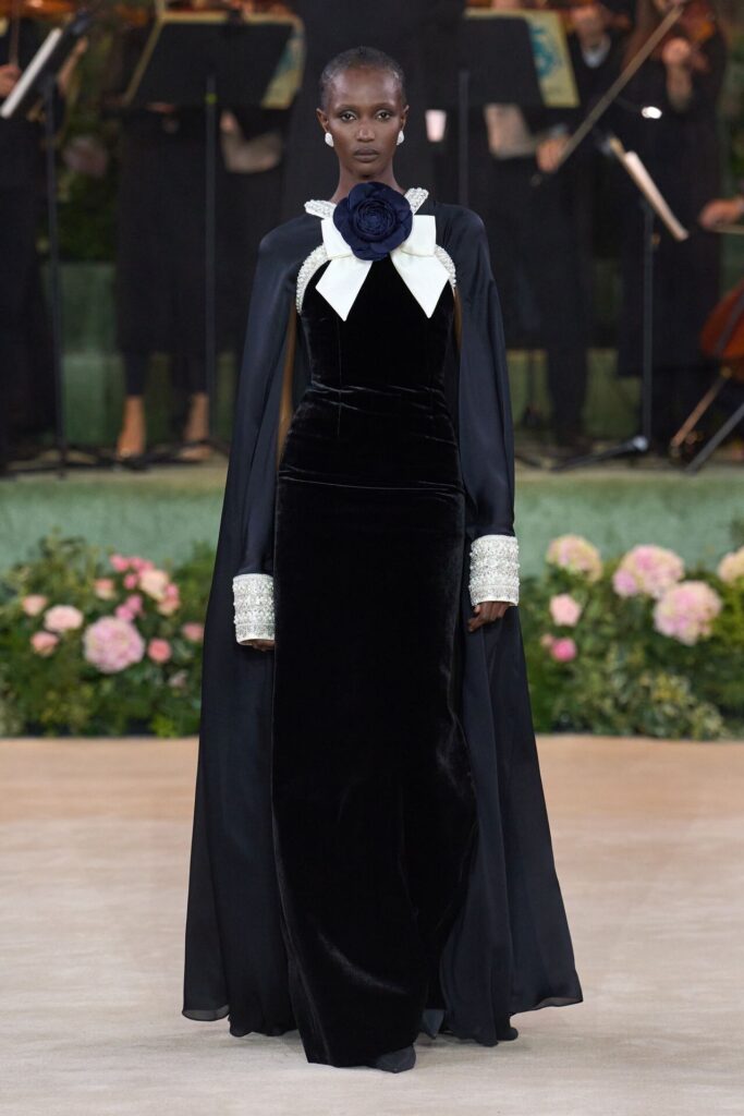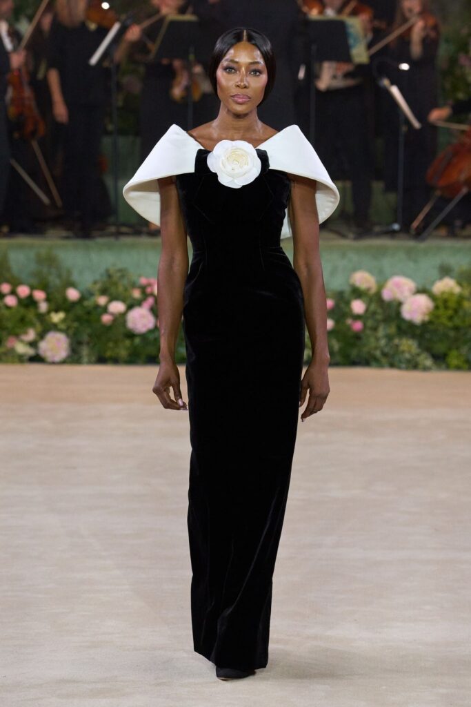 Defile, Naomi Campbell’in podyuma çıkmasıyla başladı. Siyah uzun bir elbise, omuzlardan taşan beyaz dramatik kollar ve tek bir çiçek broşuyla tamamlanmıştı. Bu güçlü açılış, koleksiyonun tonunu belirledi. Ardından Quinn’in imza niteliğindeki teatral estetiği geldi: 1920’lerin flapper stilini hatırlatan pelerinli elbiseler, Grace Kelly’nin zarafetini çağrıştıran kabarık tüller, 1970’lerin disko ışıltısını anımsatan payetli balık formlu siluetler… Her biri farklı bir döneme selam gönderirken bütününde kusursuz bir uyum sergiledi.