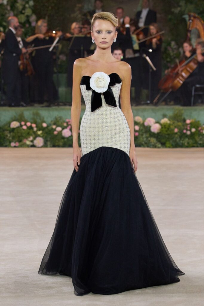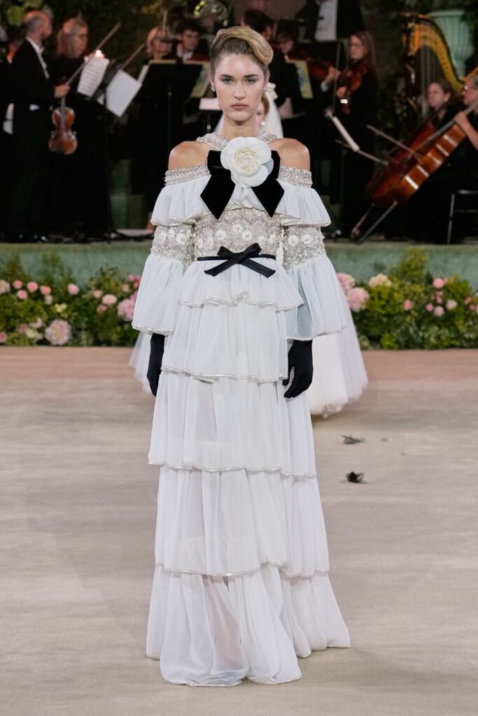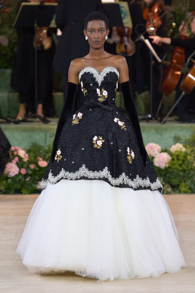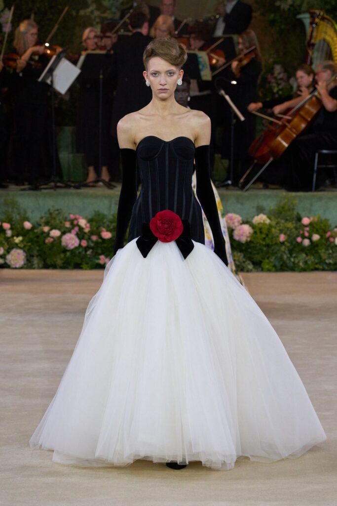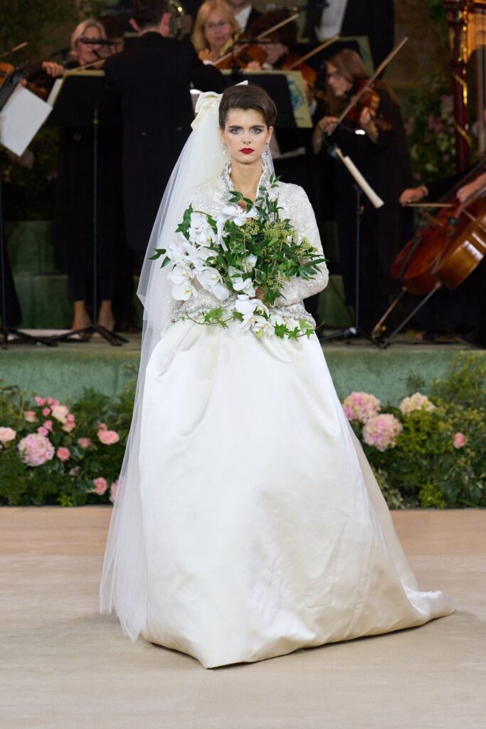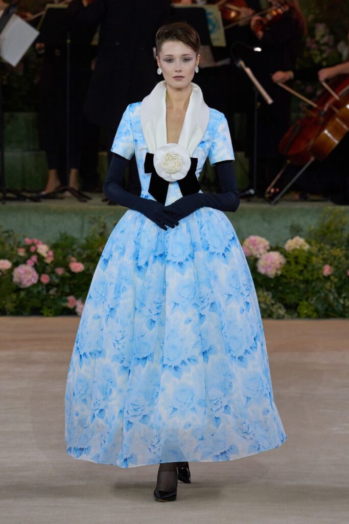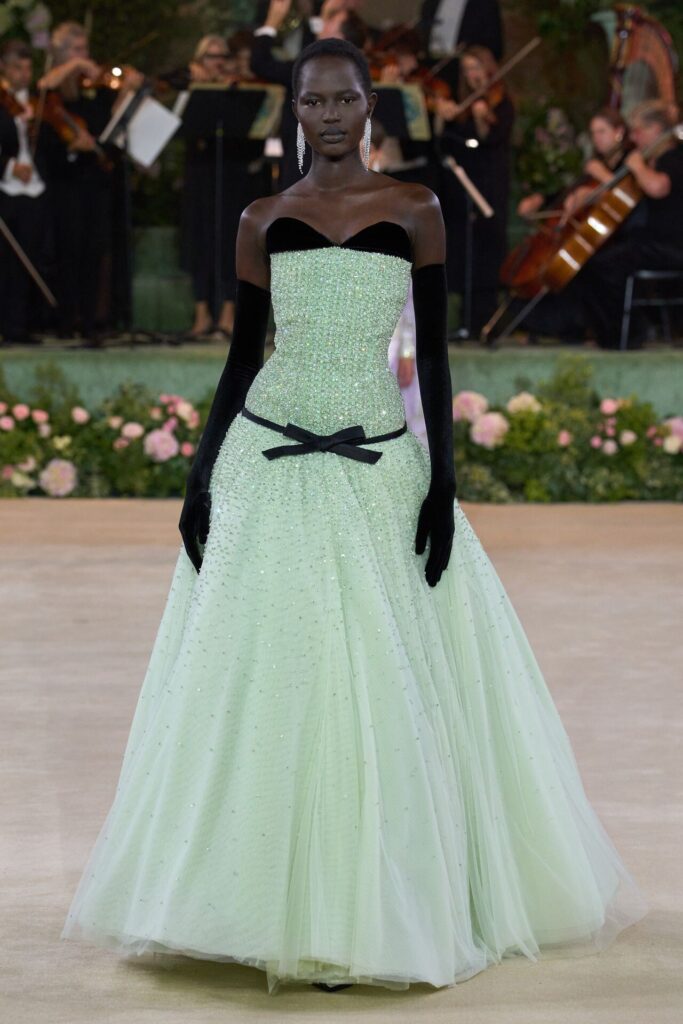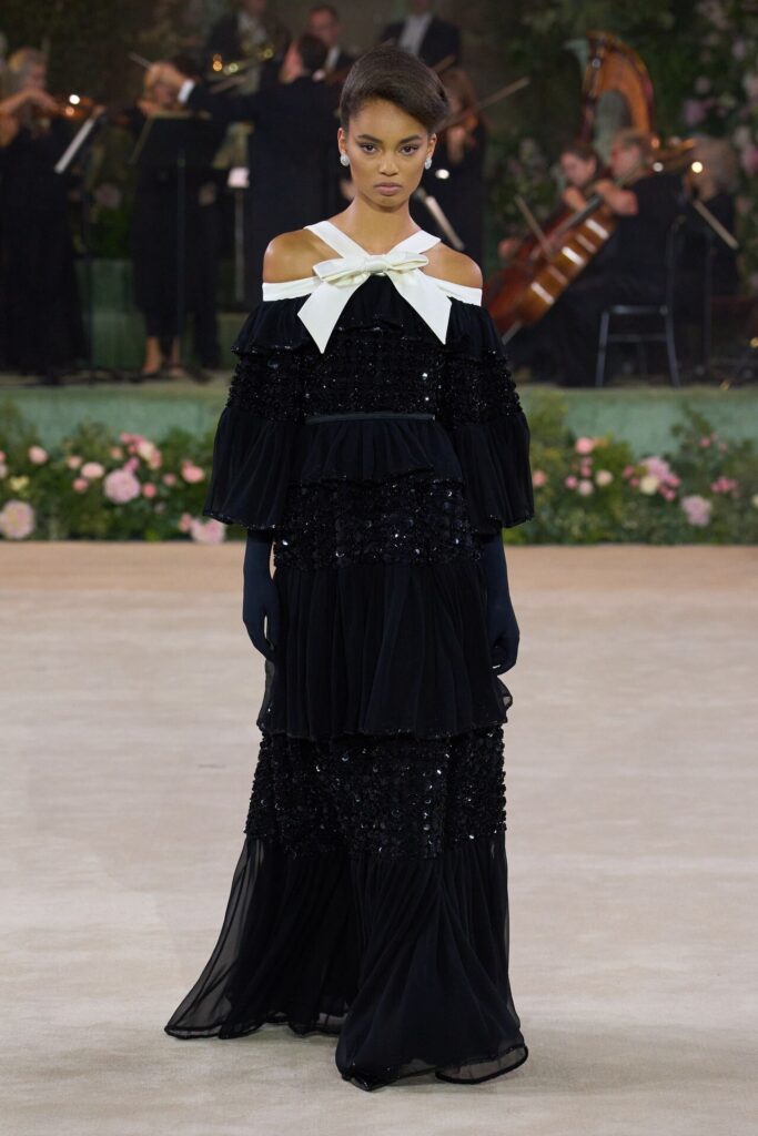 Defile, Naomi Campbell’in podyuma çıkmasıyla başladı. Siyah uzun bir elbise, omuzlardan taşan beyaz dramatik kollar ve tek bir çiçek broşuyla tamamlanmıştı. Bu güçlü açılış, koleksiyonun tonunu belirledi. Ardından Quinn’in imza niteliğindeki teatral estetiği geldi: 1920’lerin flapper stilini hatırlatan pelerinli elbiseler, Grace Kelly’nin zarafetini çağrıştıran kabarık tüller, 1970’lerin disko ışıltısını anımsatan payetli balık formlu siluetler… Her biri farklı bir döneme selam gönderirken bütününde kusursuz bir uyum sergiledi.