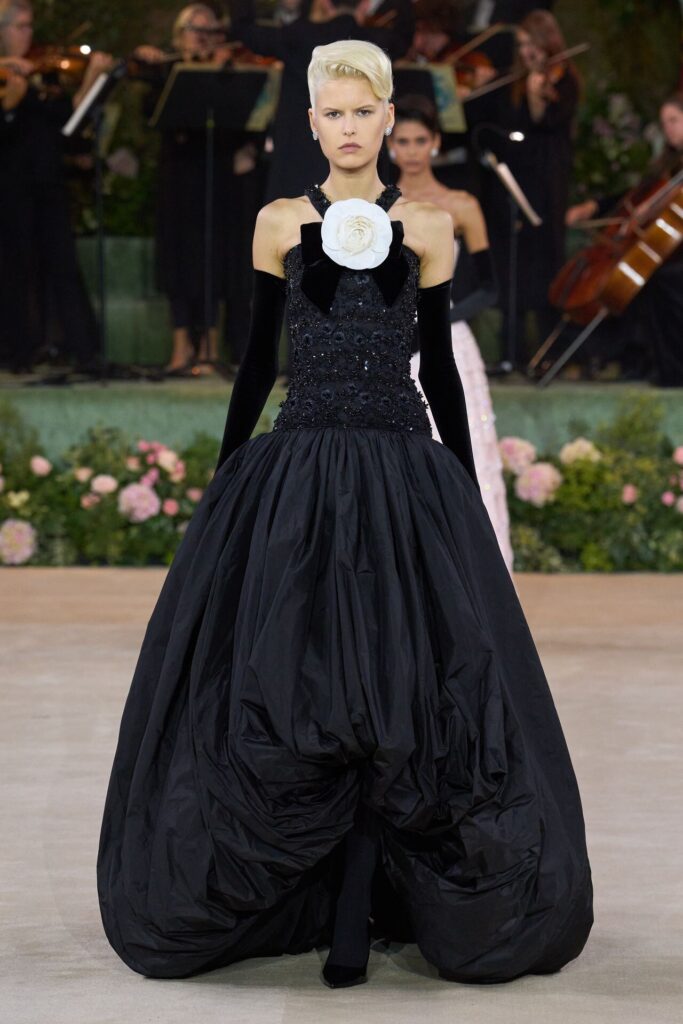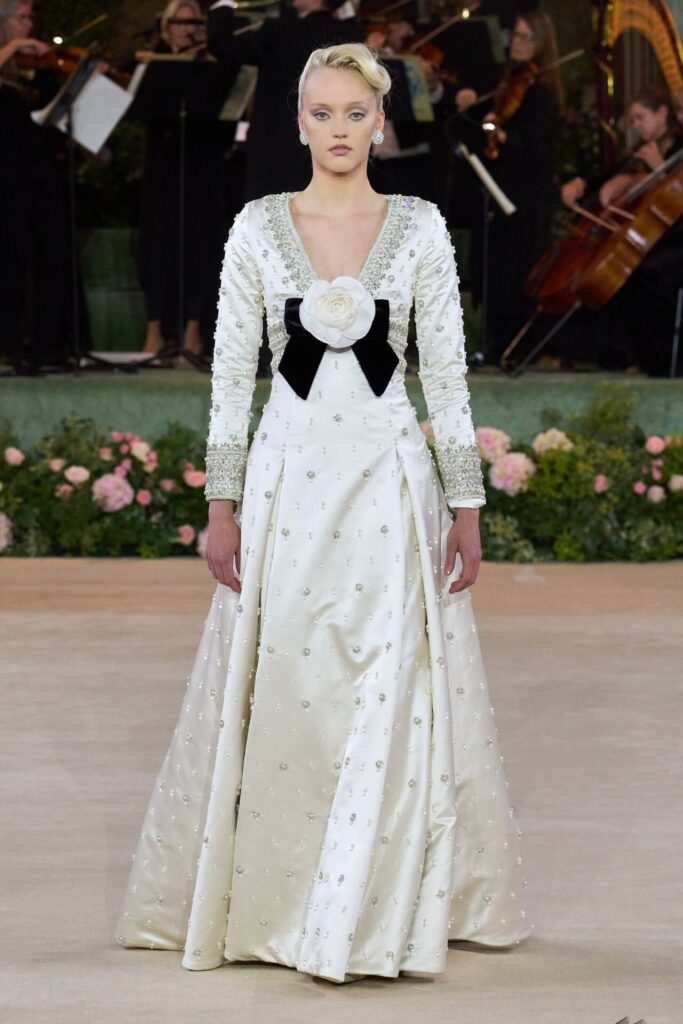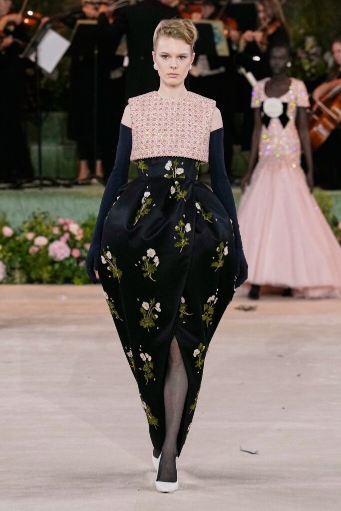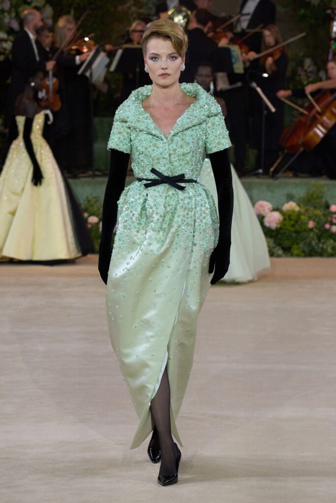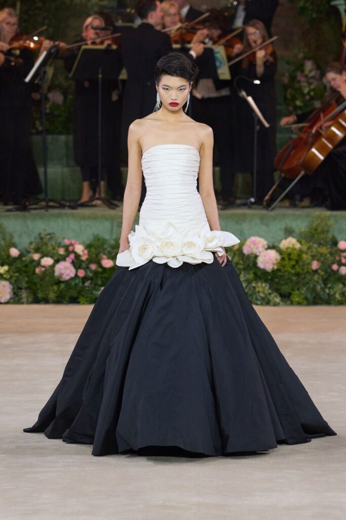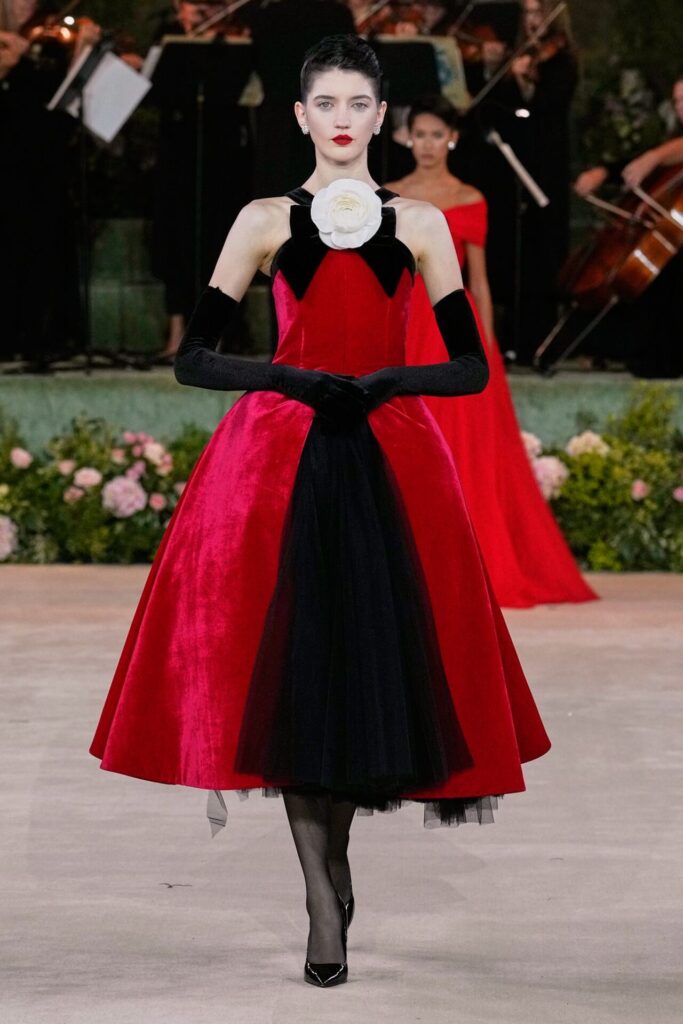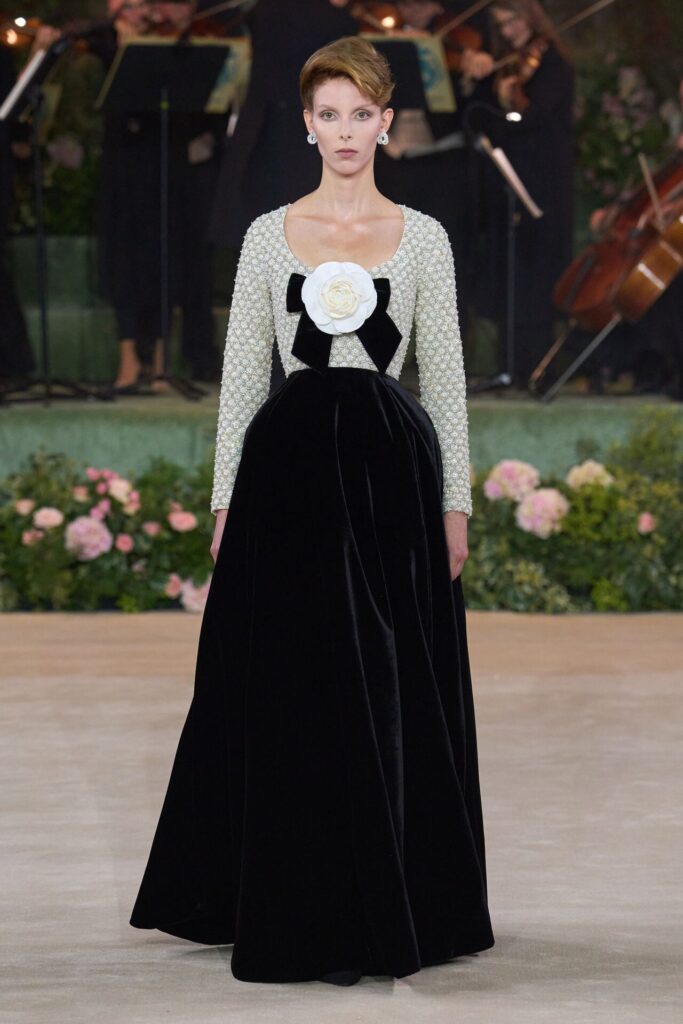 Defile, Naomi Campbell’in podyuma çıkmasıyla başladı. Siyah uzun bir elbise, omuzlardan taşan beyaz dramatik kollar ve tek bir çiçek broşuyla tamamlanmıştı. Bu güçlü açılış, koleksiyonun tonunu belirledi. Ardından Quinn’in imza niteliğindeki teatral estetiği geldi: 1920’lerin flapper stilini hatırlatan pelerinli elbiseler, Grace Kelly’nin zarafetini çağrıştıran kabarık tüller, 1970’lerin disko ışıltısını anımsatan payetli balık formlu siluetler… Her biri farklı bir döneme selam gönderirken bütününde kusursuz bir uyum sergiledi.