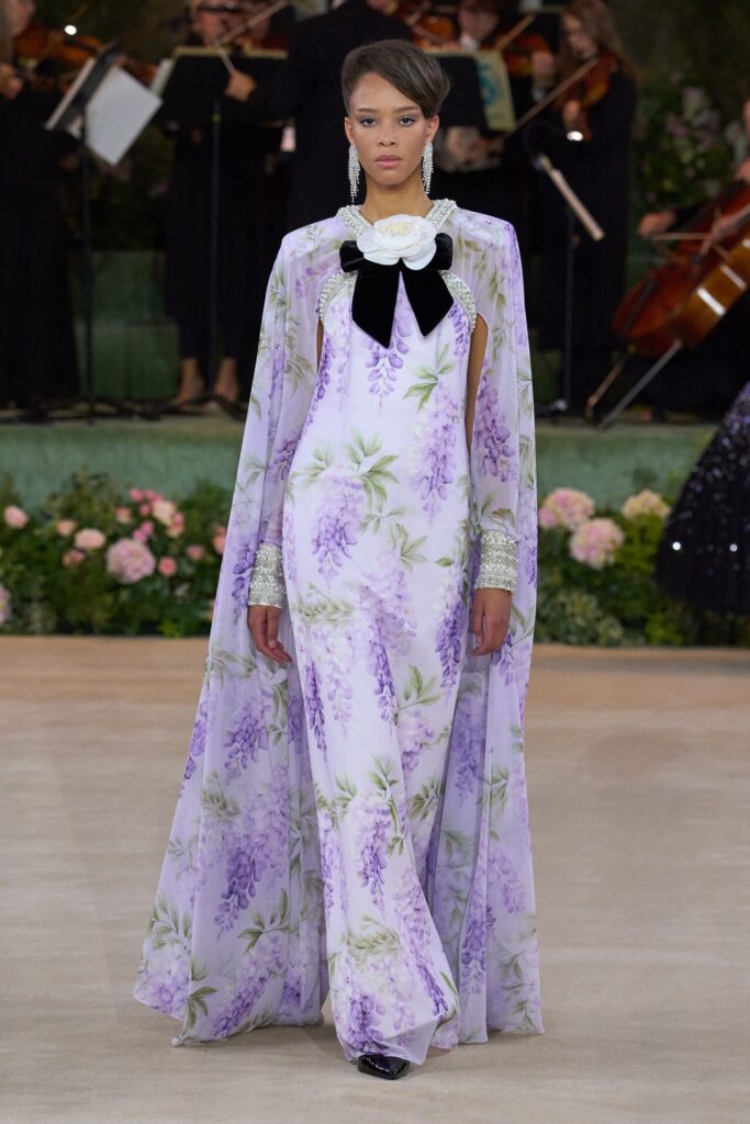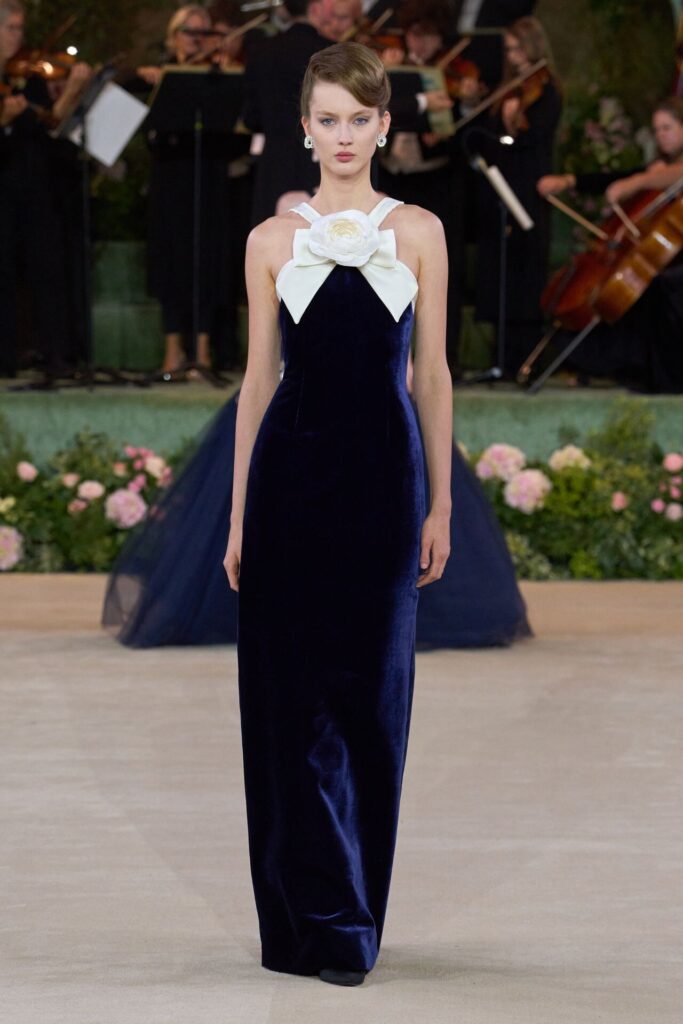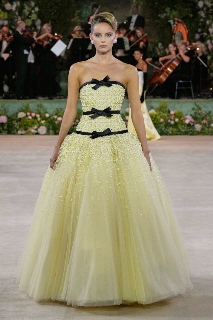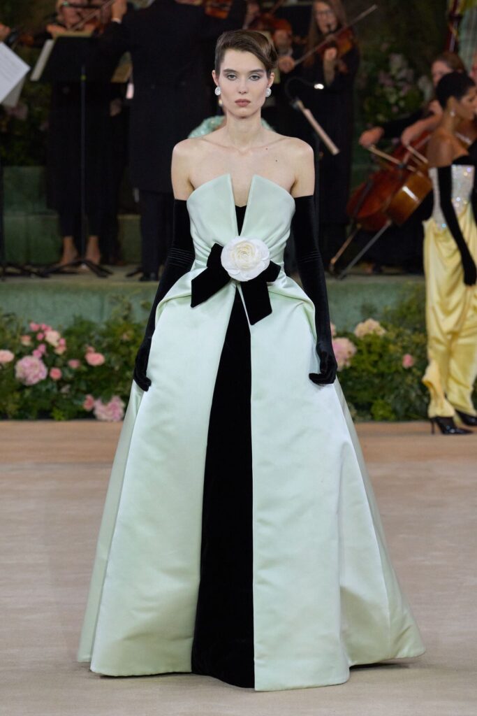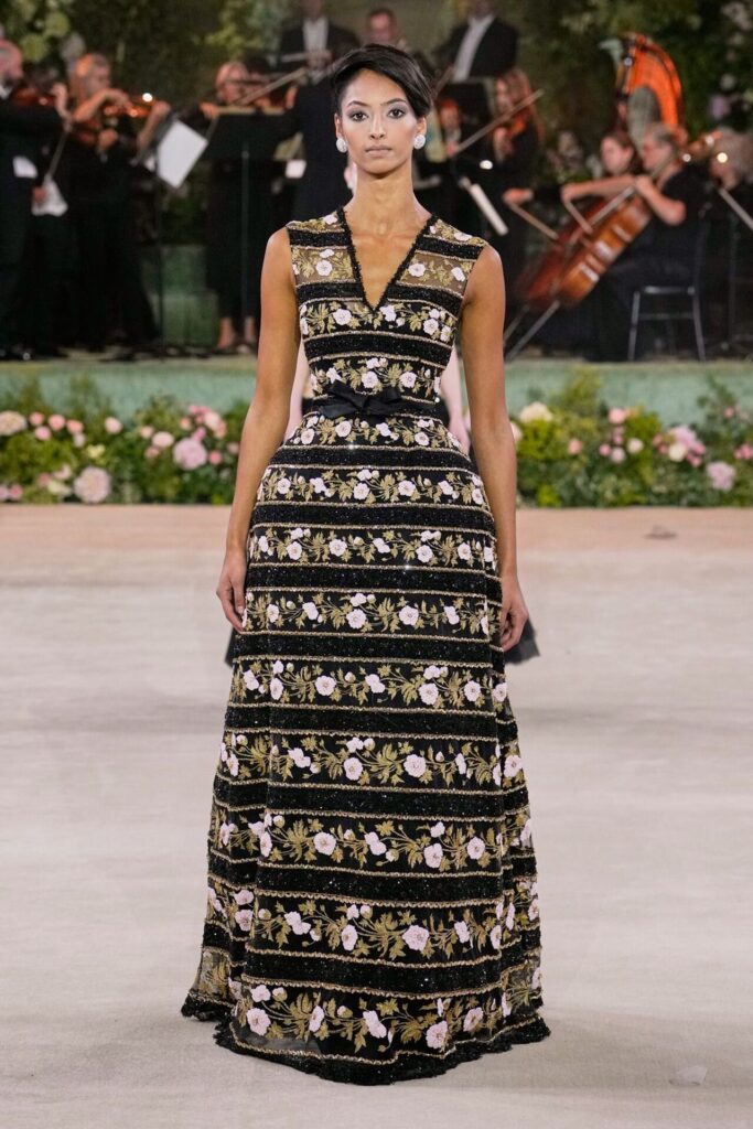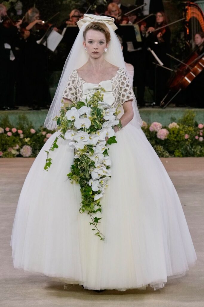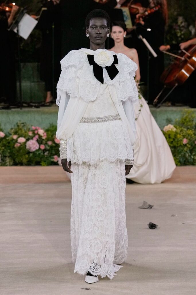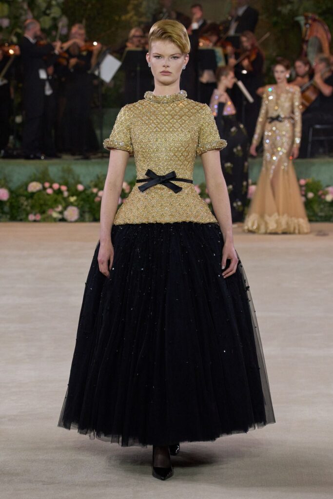 Defile, Naomi Campbell’in podyuma çıkmasıyla başladı. Siyah uzun bir elbise, omuzlardan taşan beyaz dramatik kollar ve tek bir çiçek broşuyla tamamlanmıştı. Bu güçlü açılış, koleksiyonun tonunu belirledi. Ardından Quinn’in imza niteliğindeki teatral estetiği geldi: 1920’lerin flapper stilini hatırlatan pelerinli elbiseler, Grace Kelly’nin zarafetini çağrıştıran kabarık tüller, 1970’lerin disko ışıltısını anımsatan payetli balık formlu siluetler… Her biri farklı bir döneme selam gönderirken bütününde kusursuz bir uyum sergiledi.