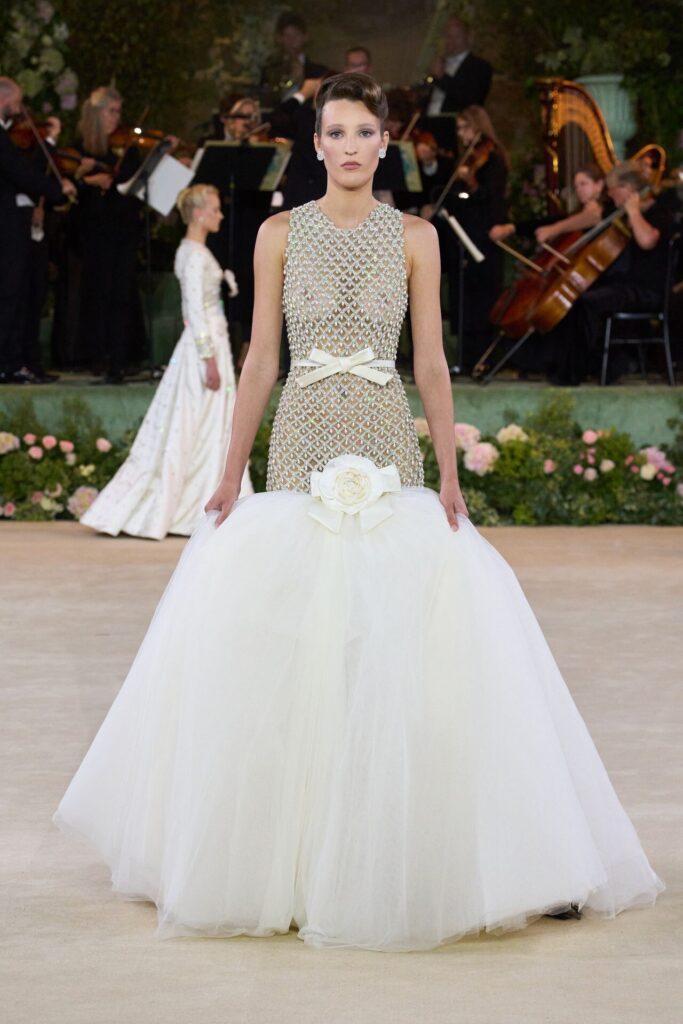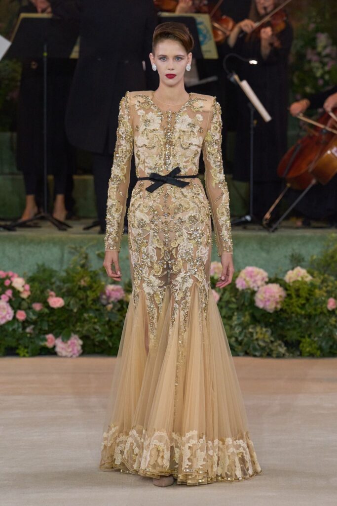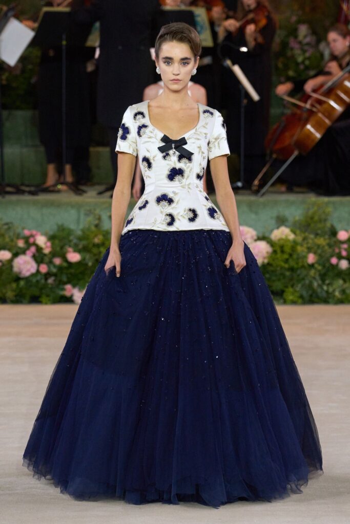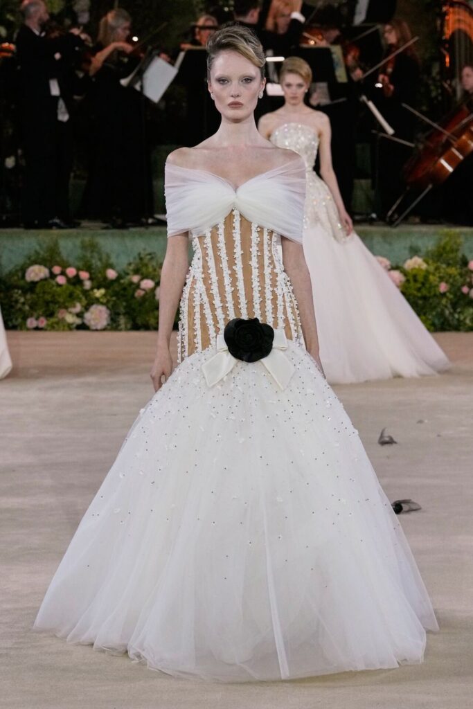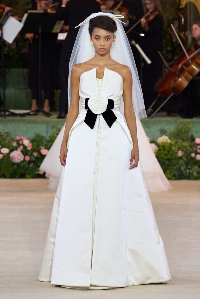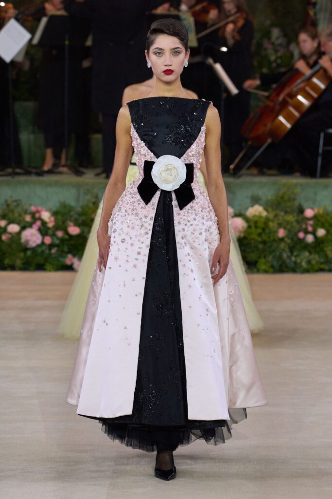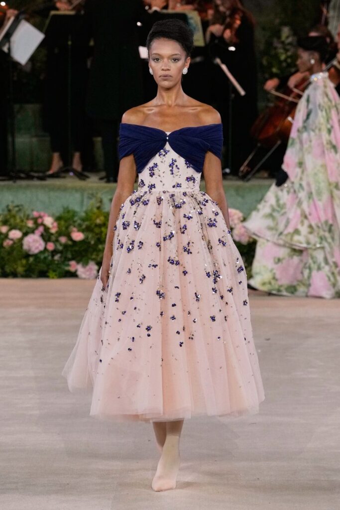 Defile, Naomi Campbell’in podyuma çıkmasıyla başladı. Siyah uzun bir elbise, omuzlardan taşan beyaz dramatik kollar ve tek bir çiçek broşuyla tamamlanmıştı. Bu güçlü açılış, koleksiyonun tonunu belirledi. Ardından Quinn’in imza niteliğindeki teatral estetiği geldi: 1920’lerin flapper stilini hatırlatan pelerinli elbiseler, Grace Kelly’nin zarafetini çağrıştıran kabarık tüller, 1970’lerin disko ışıltısını anımsatan payetli balık formlu siluetler… Her biri farklı bir döneme selam gönderirken bütününde kusursuz bir uyum sergiledi.