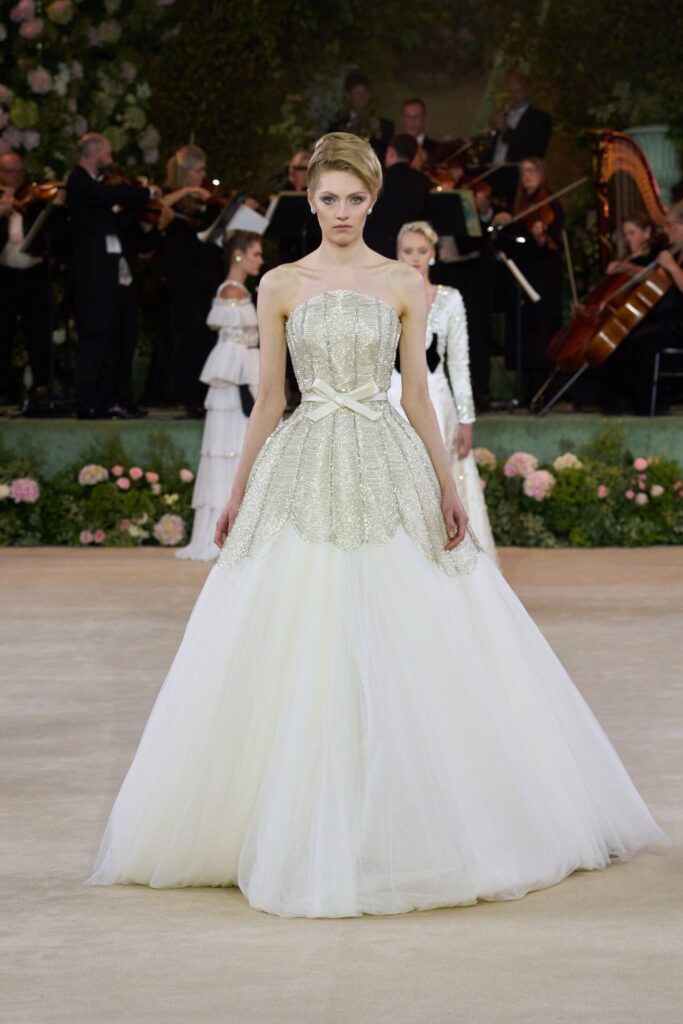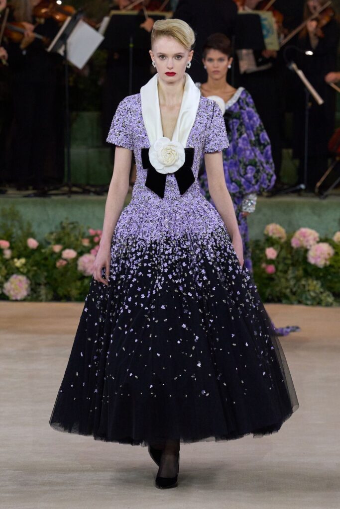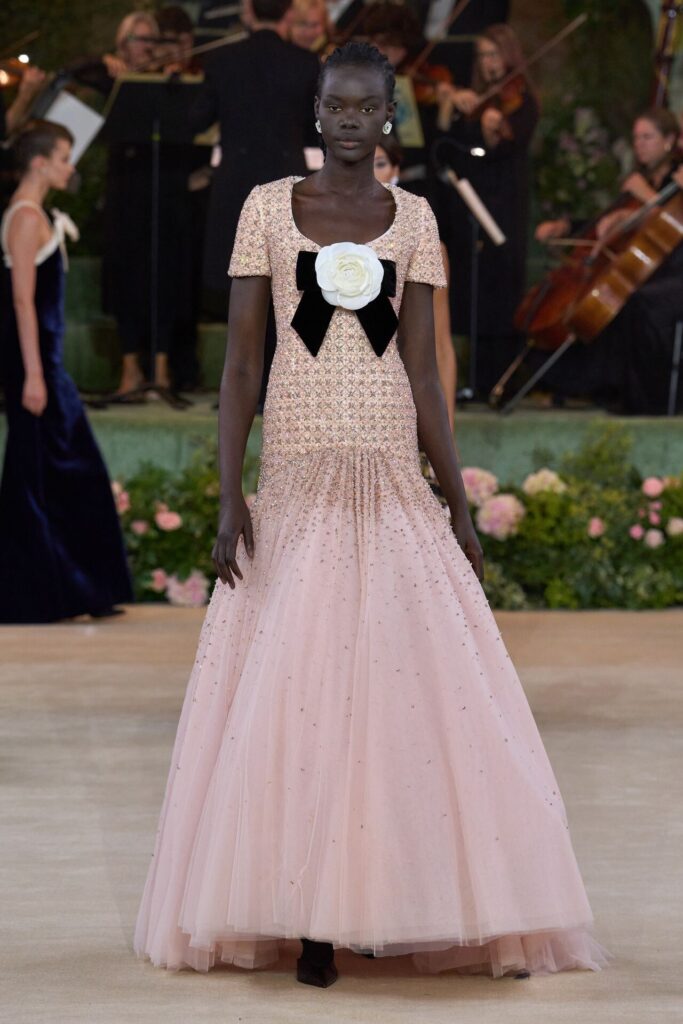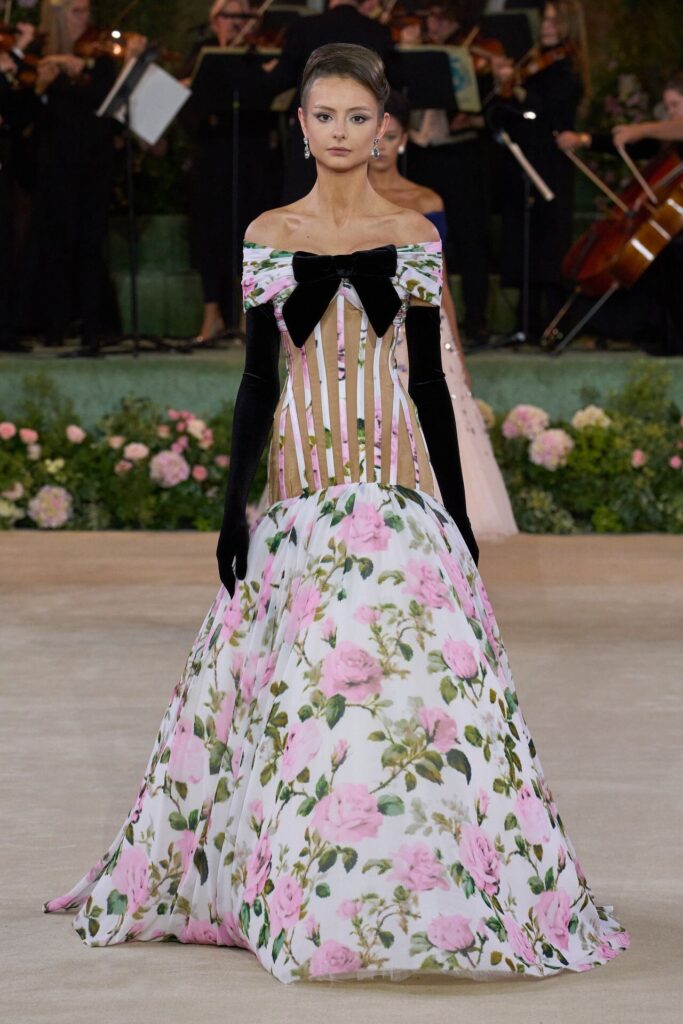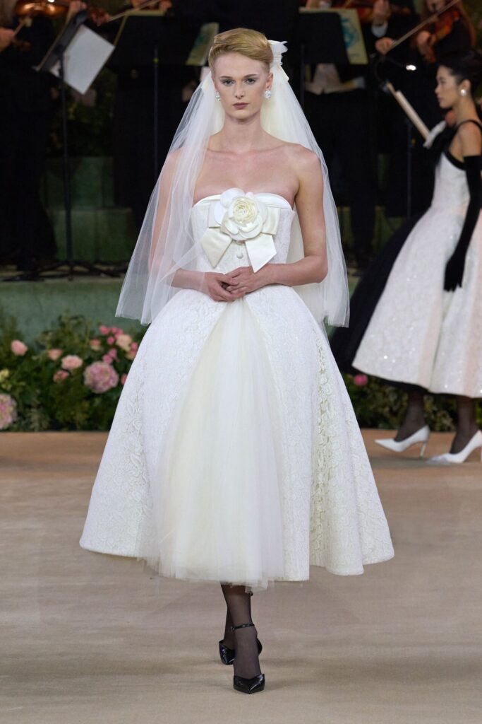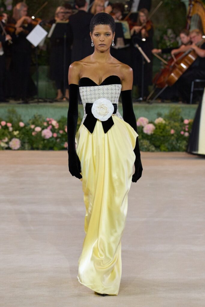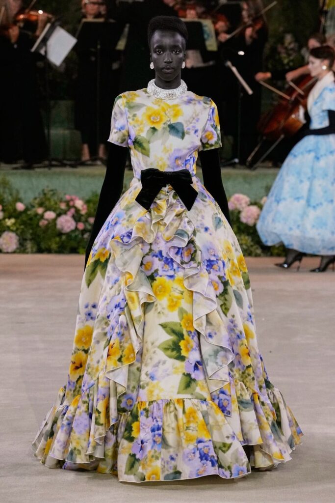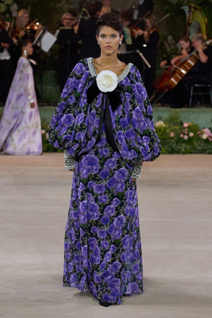 Defile, Naomi Campbell’in podyuma çıkmasıyla başladı. Siyah uzun bir elbise, omuzlardan taşan beyaz dramatik kollar ve tek bir çiçek broşuyla tamamlanmıştı. Bu güçlü açılış, koleksiyonun tonunu belirledi. Ardından Quinn’in imza niteliğindeki teatral estetiği geldi: 1920’lerin flapper stilini hatırlatan pelerinli elbiseler, Grace Kelly’nin zarafetini çağrıştıran kabarık tüller, 1970’lerin disko ışıltısını anımsatan payetli balık formlu siluetler… Her biri farklı bir döneme selam gönderirken bütününde kusursuz bir uyum sergiledi.